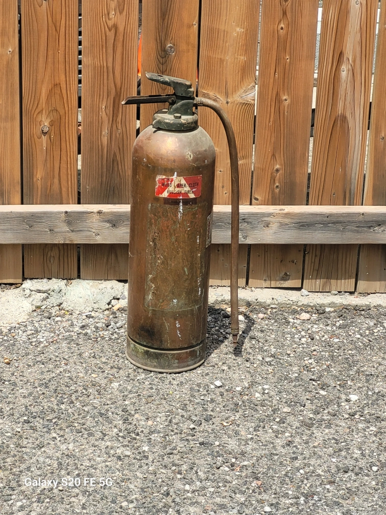 Selling a vintage fire extinguisher. It has a unique, aged look and could be a great decorative piece for your home or shop. It shows signs of wear and tear, which adds to its charm