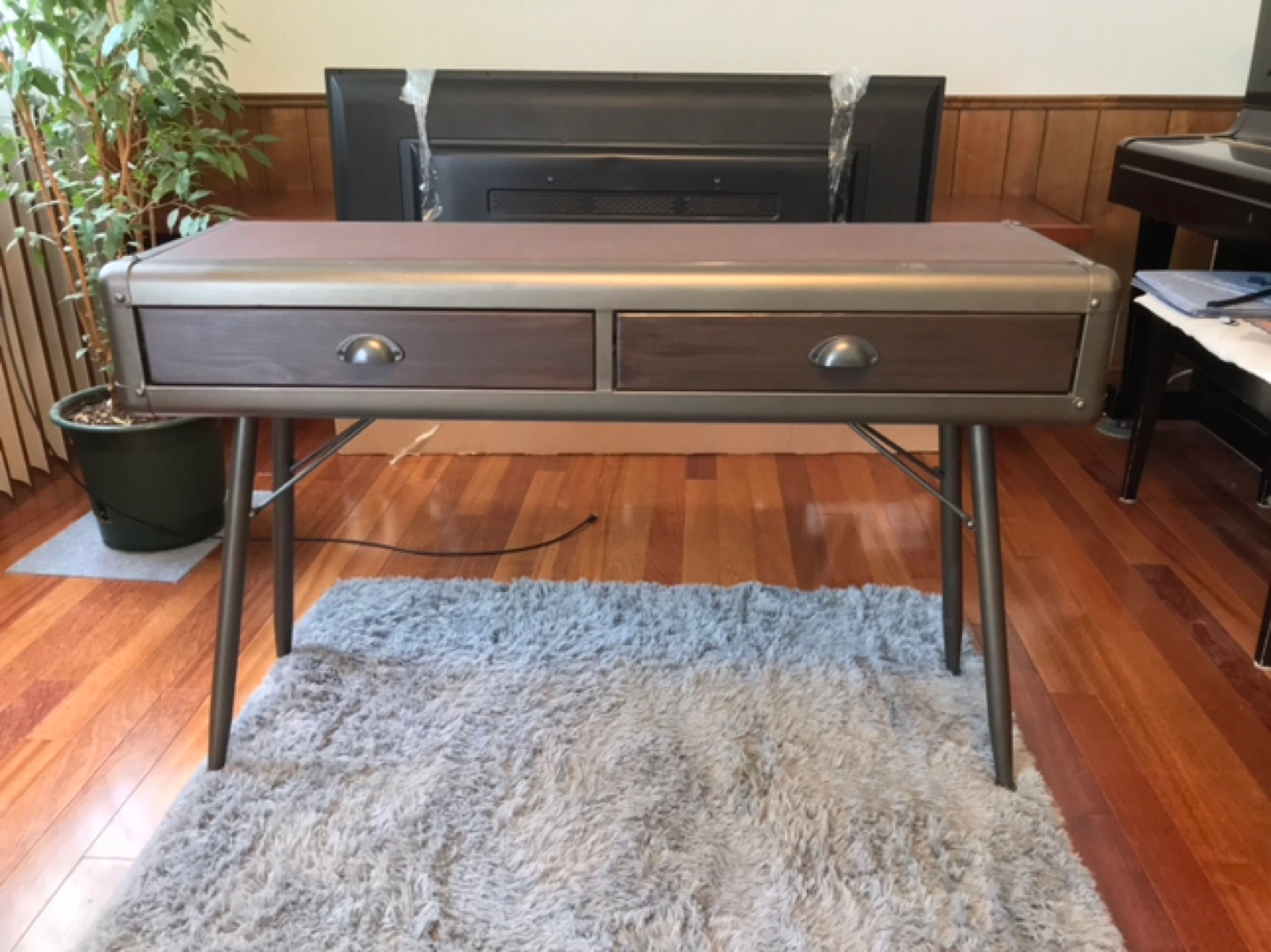Selling a desk with an industrial style. It features a brown leather top, metal frame, and two drawers. It's in great condition and would be a nice addition to any home office or workspace
