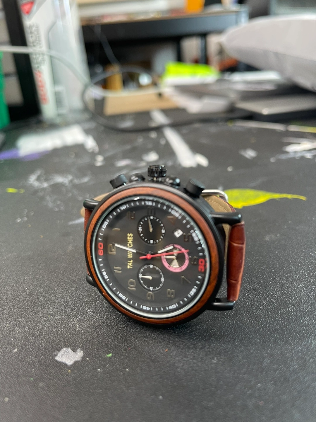 Selling a TAL WATCHES men's watch with a brown leather strap. This stylish timepiece features a black dial with chronograph subdials and a wood-tone bezel. It's in great condition and ready to wear!