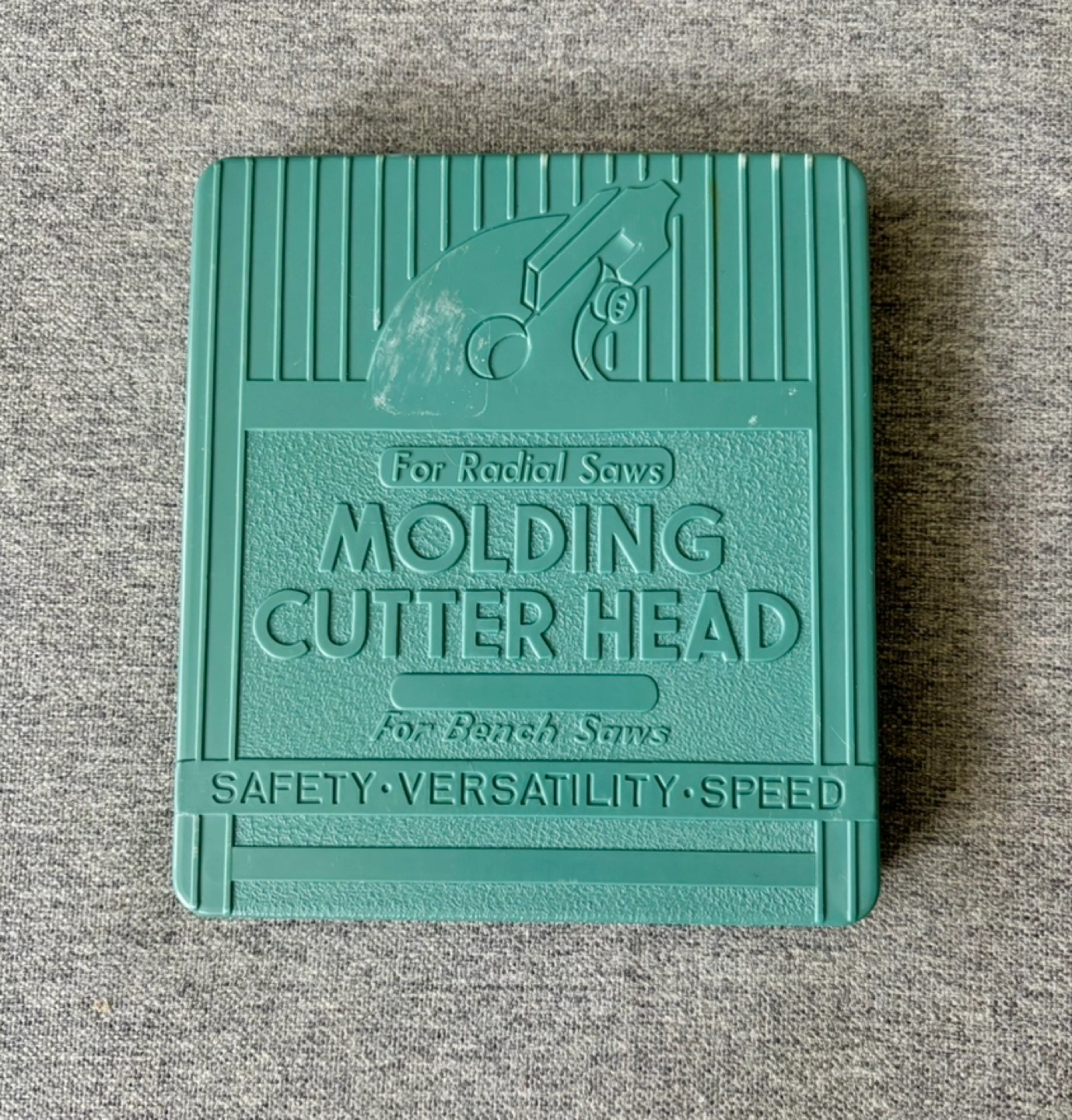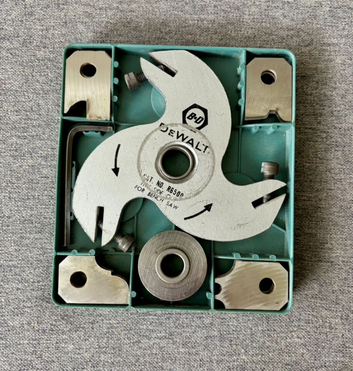 Selling a DEWALT/Black and Decker molding cutter head set, model number R6500. It's designed for radial and bench saws, emphasizing safety, versatility, and speed. Includes various cutter head components and an Allen key, all neatly organized in its original case.