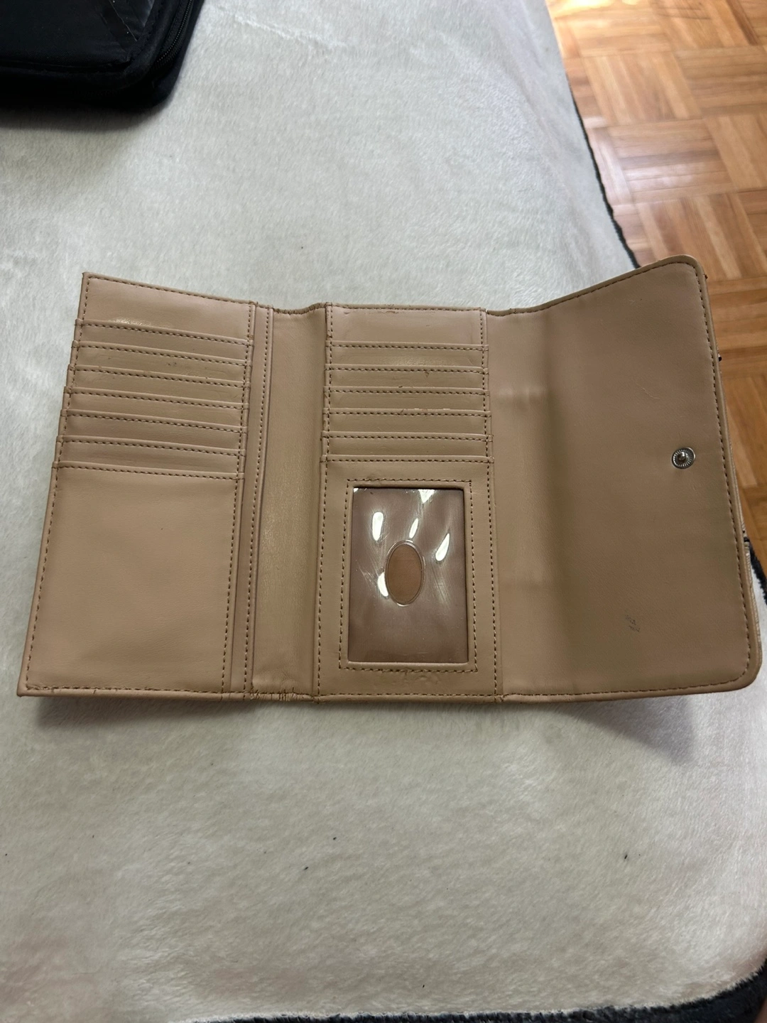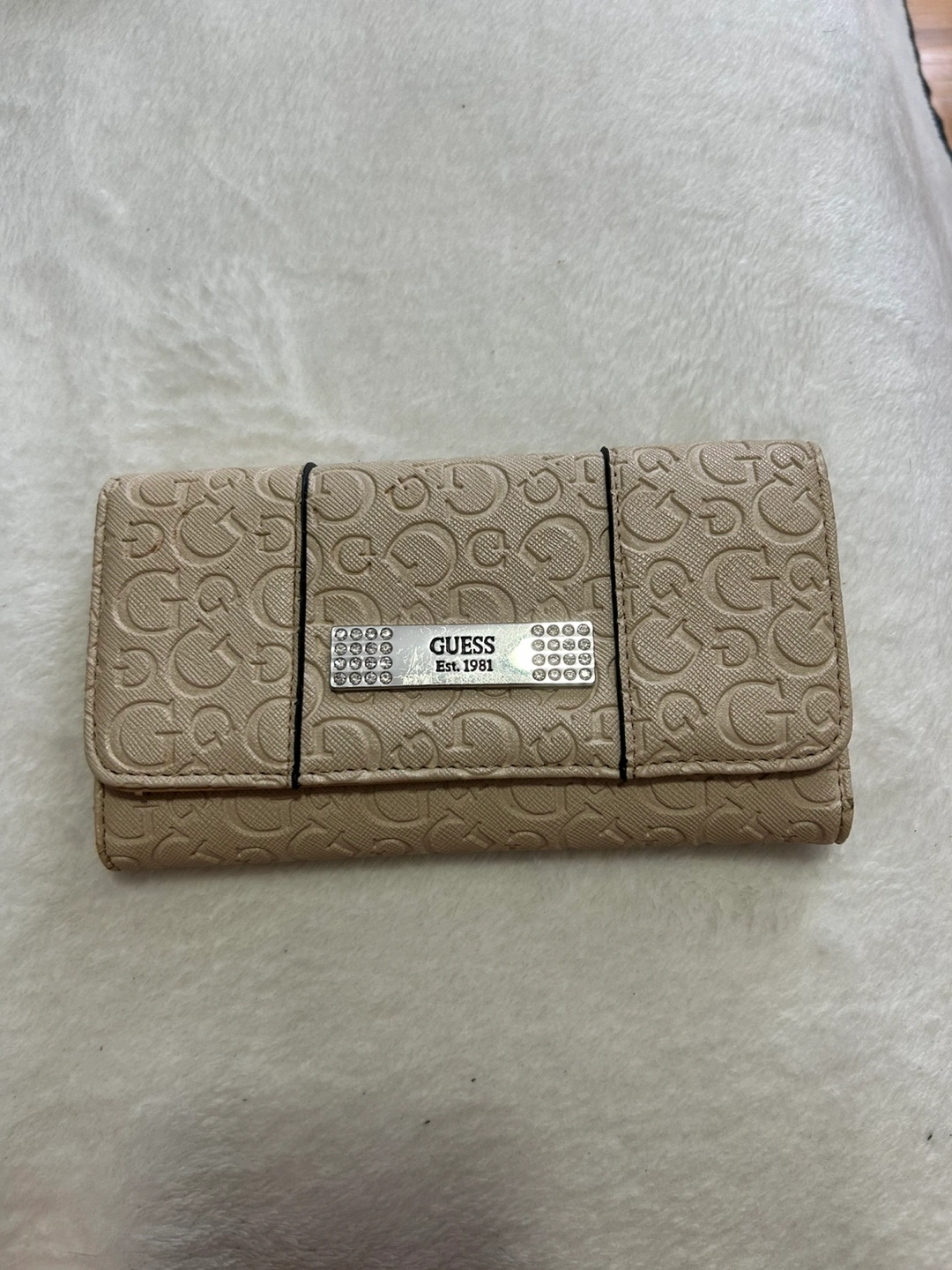 In good condition. It’s a beige colour with the guess logo all over it. Plenty of card spots, three cash compartments or even for coupons, and a coin pocket at the back.