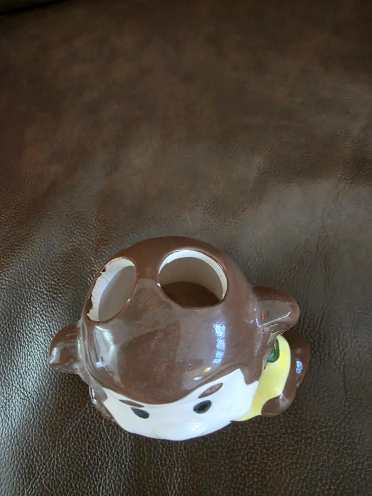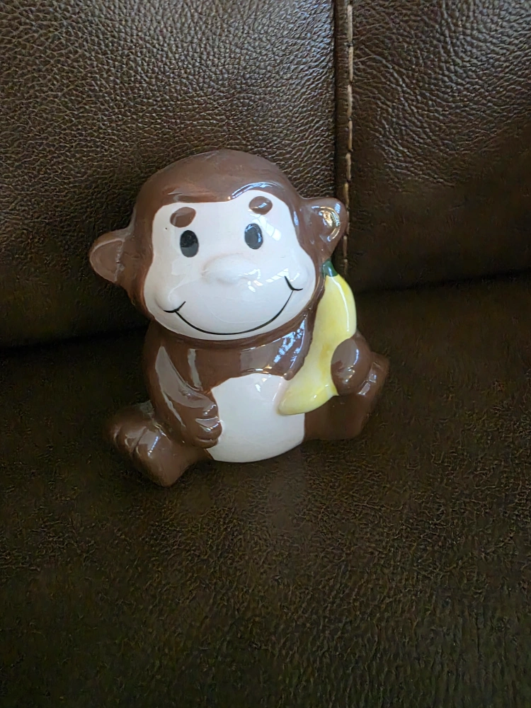 I'm selling this cute monkey figurine. It's brown and white and holding a banana. This would be great for a kid's room or just a fun decoration