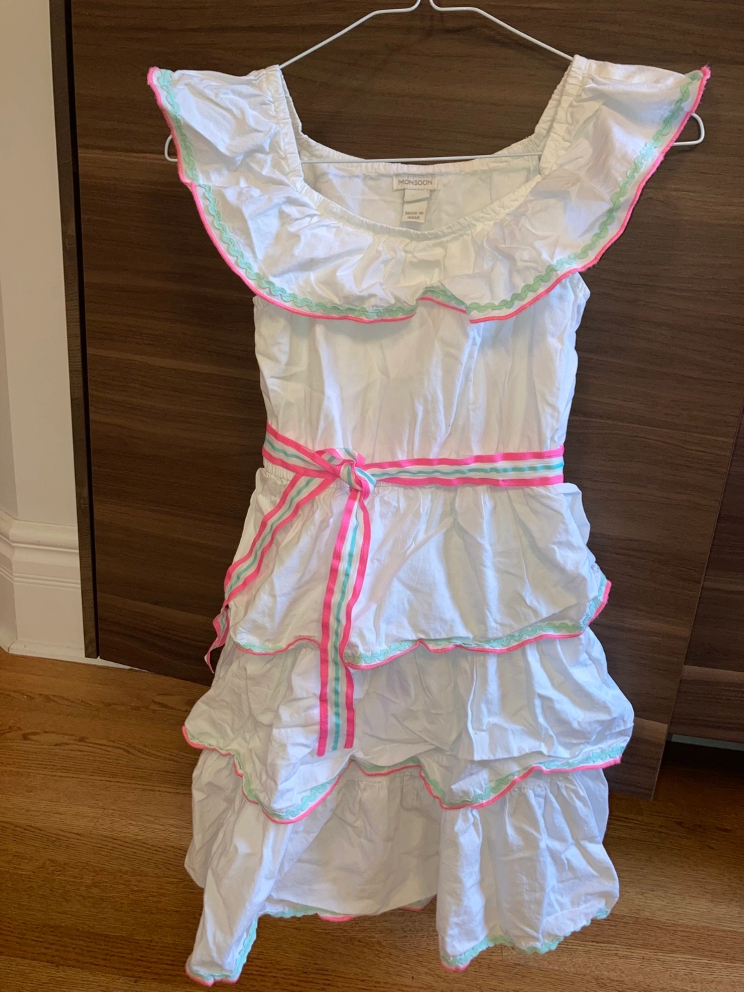 Cute Monsoon white 100% cotton dress with ruffled details! It has a colourful ribbon belt and tiered skirt. Perfect for summer!