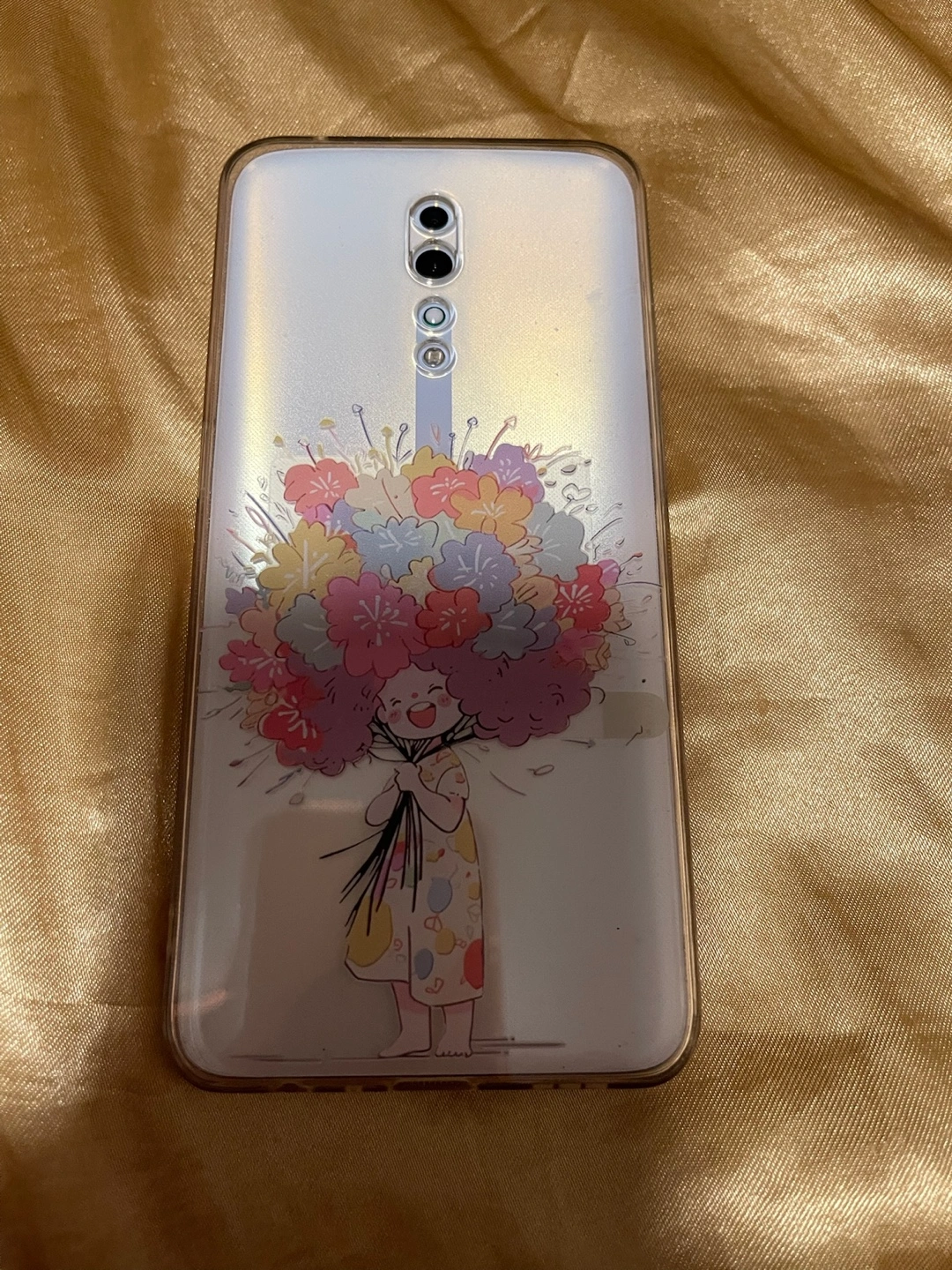 Selling a phone case with a cute floral design! It features a girl holding a bouquet of colourful flowers. It's in great condition and ready for a new phone to protect