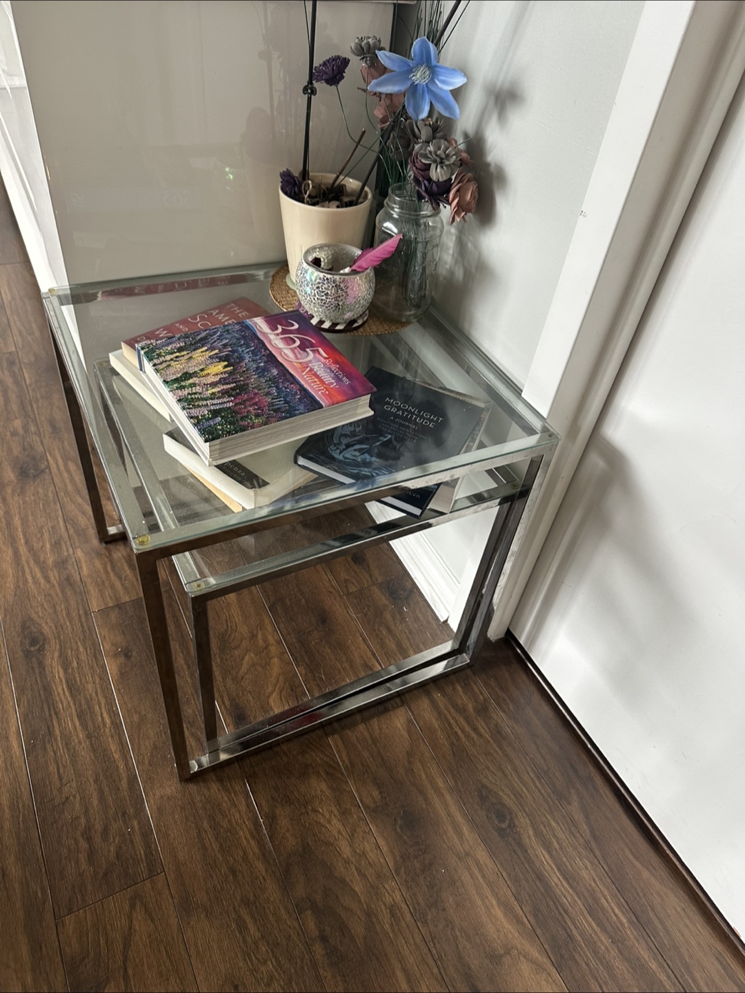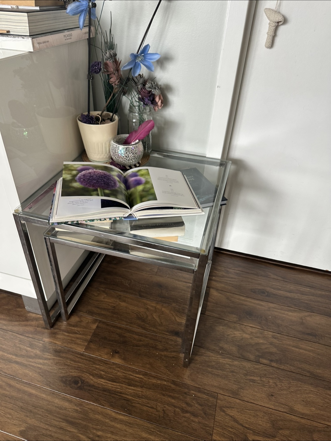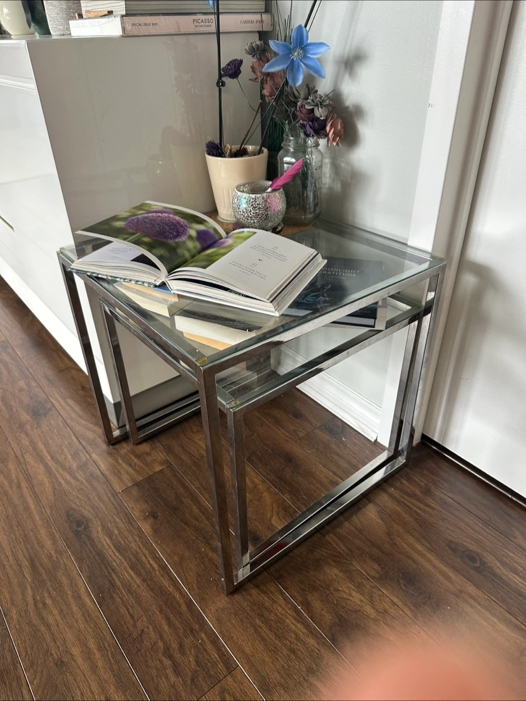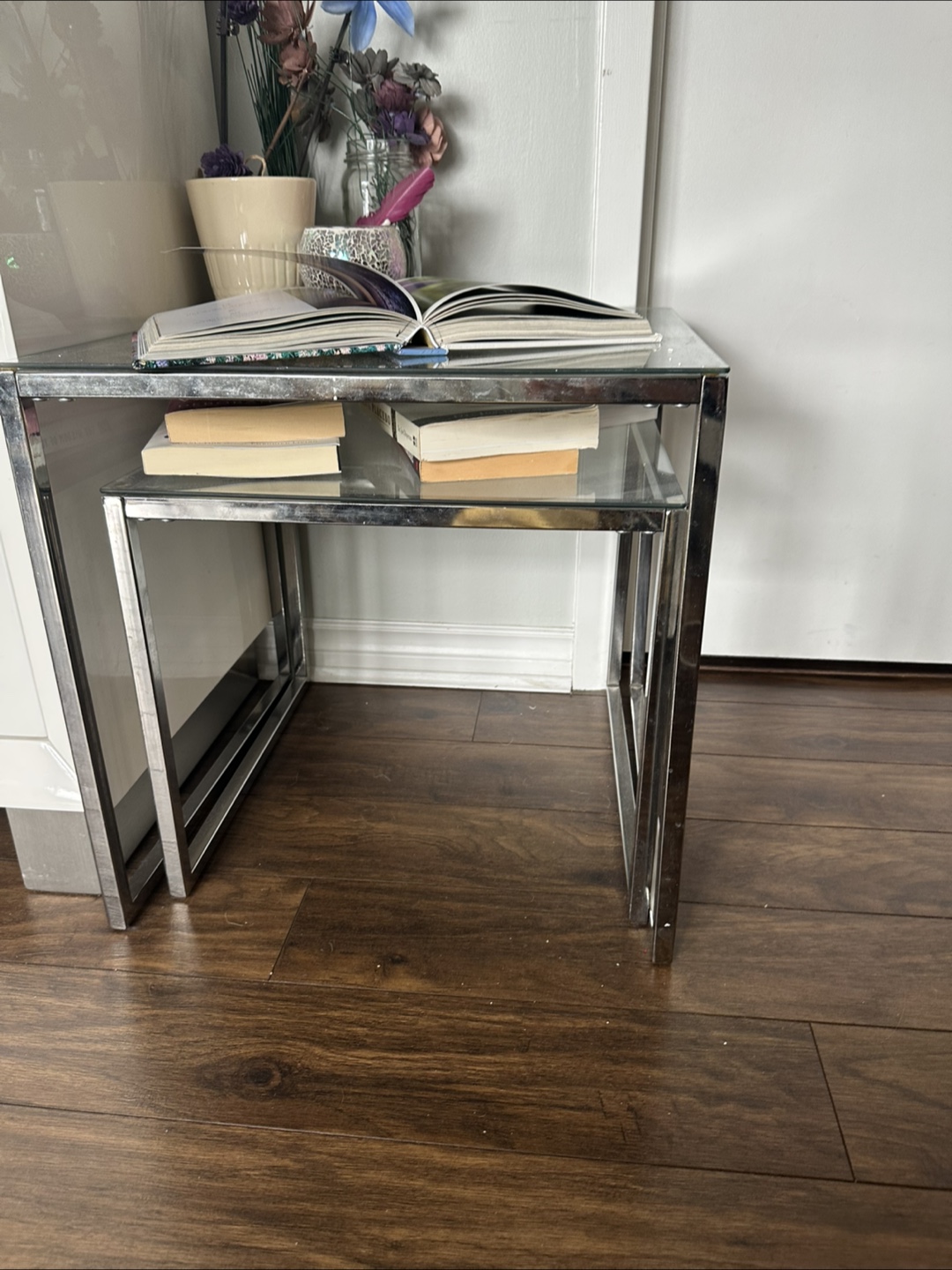 Here are some nesting side tables with a chrome frame and glass top. They're in good condition and would be a great addition to any living space!