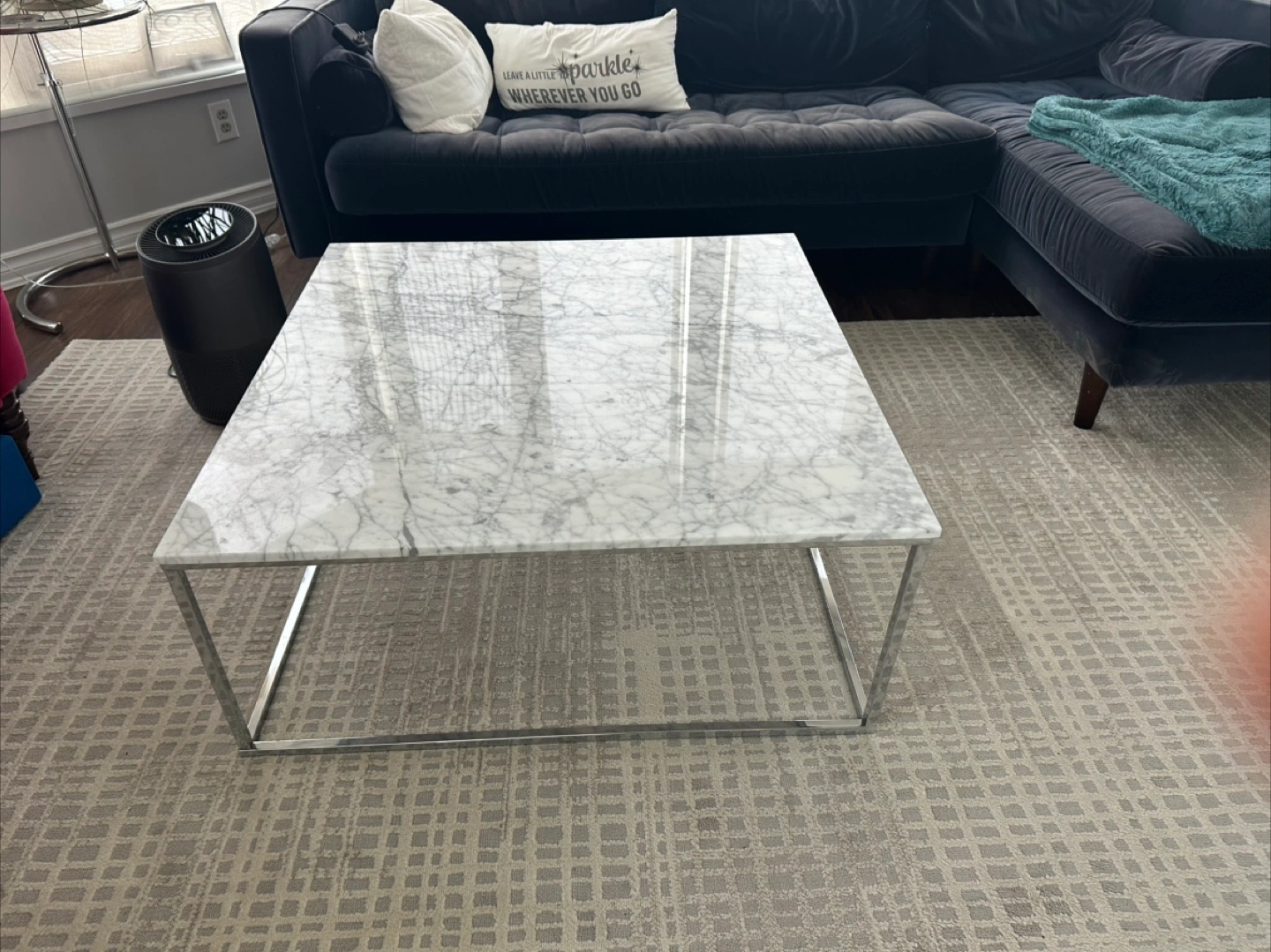 Selling a stylish coffee table with a beautiful marble top. It has a modern look that would fit well in any living space. The base is a sleek, silver-toned metal frame.
