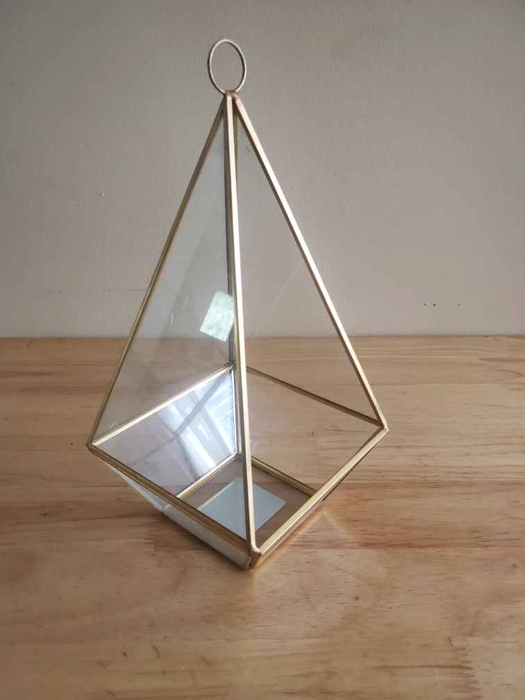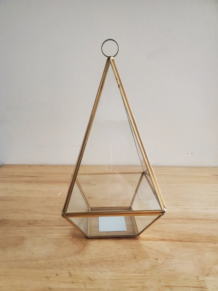 Selling 10 geometric terrariums! Great for adding a touch of modern elegance to your space. Perfect for small plants or displaying decorative items. It has a gold trim and a unique pyramid shape that catches the eye. It's in great condition and ready to brighten up your home! Used in wedding center pieces. Paid $60