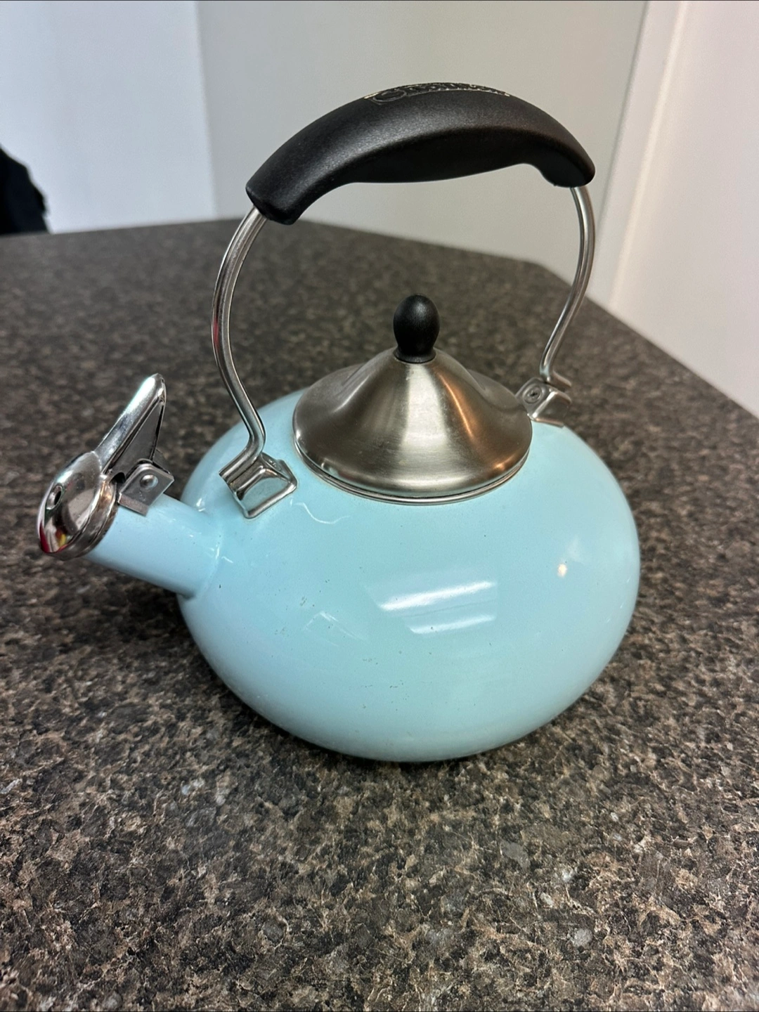 Here's a lovely light blue Chantal enameled steel teakettle! It's in great shape and ready to boil water for your tea or coffee. The kettle has a classic design that will look great in any kitchen.
