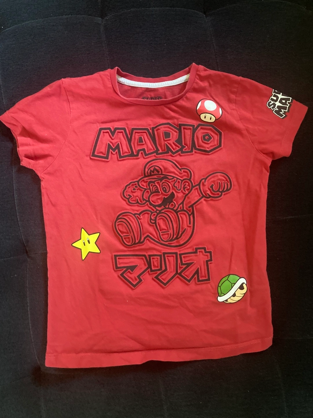 A fun red t-shirt featuring Mario! It has Mario's image and name on the front, along with some cool icons like a mushroom, star, and turtle shell