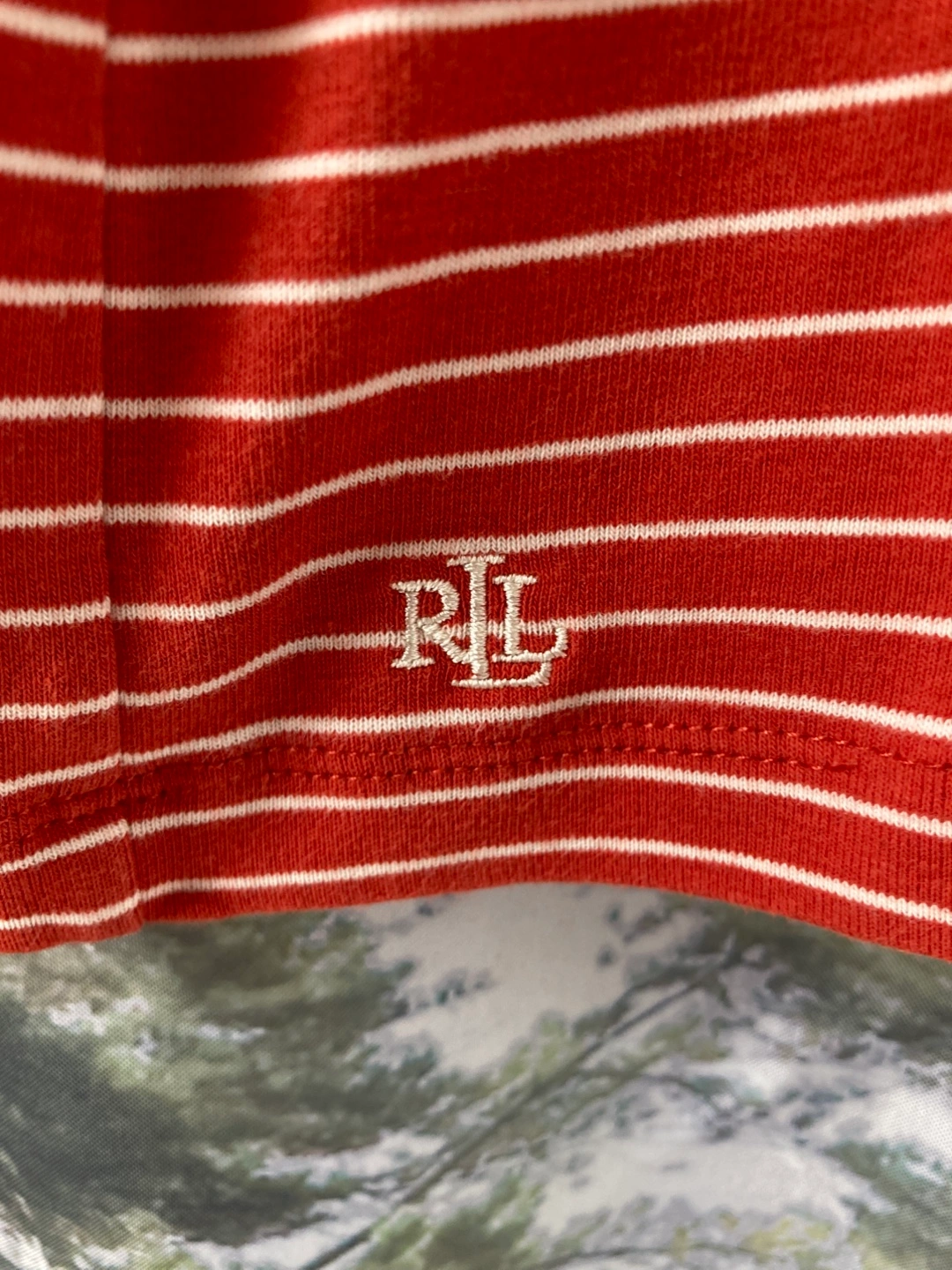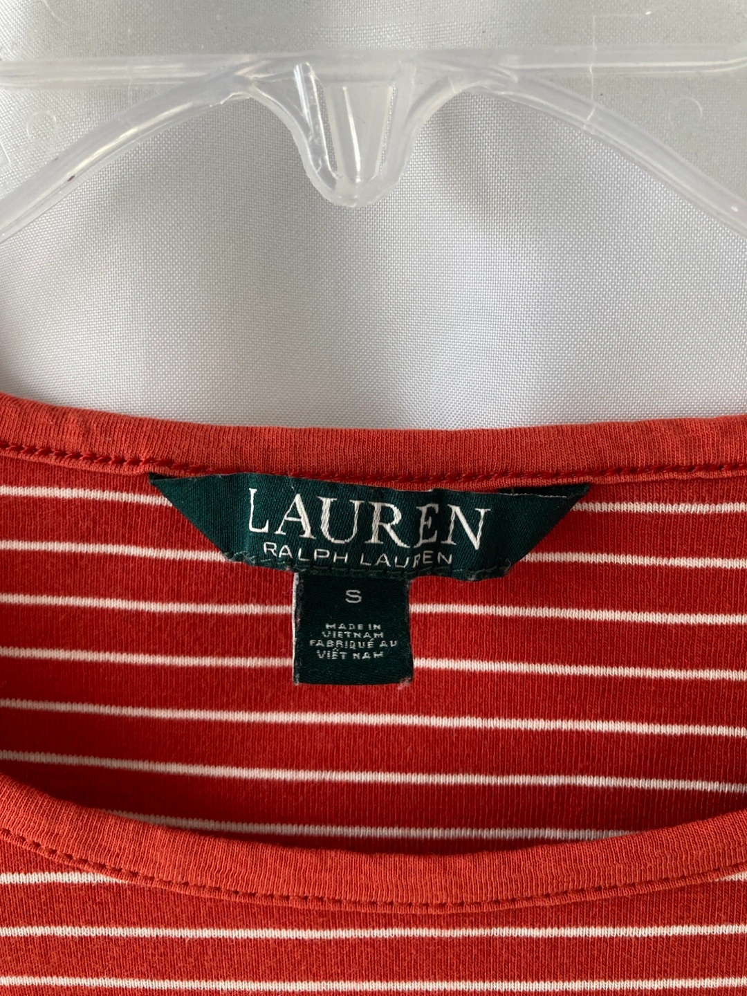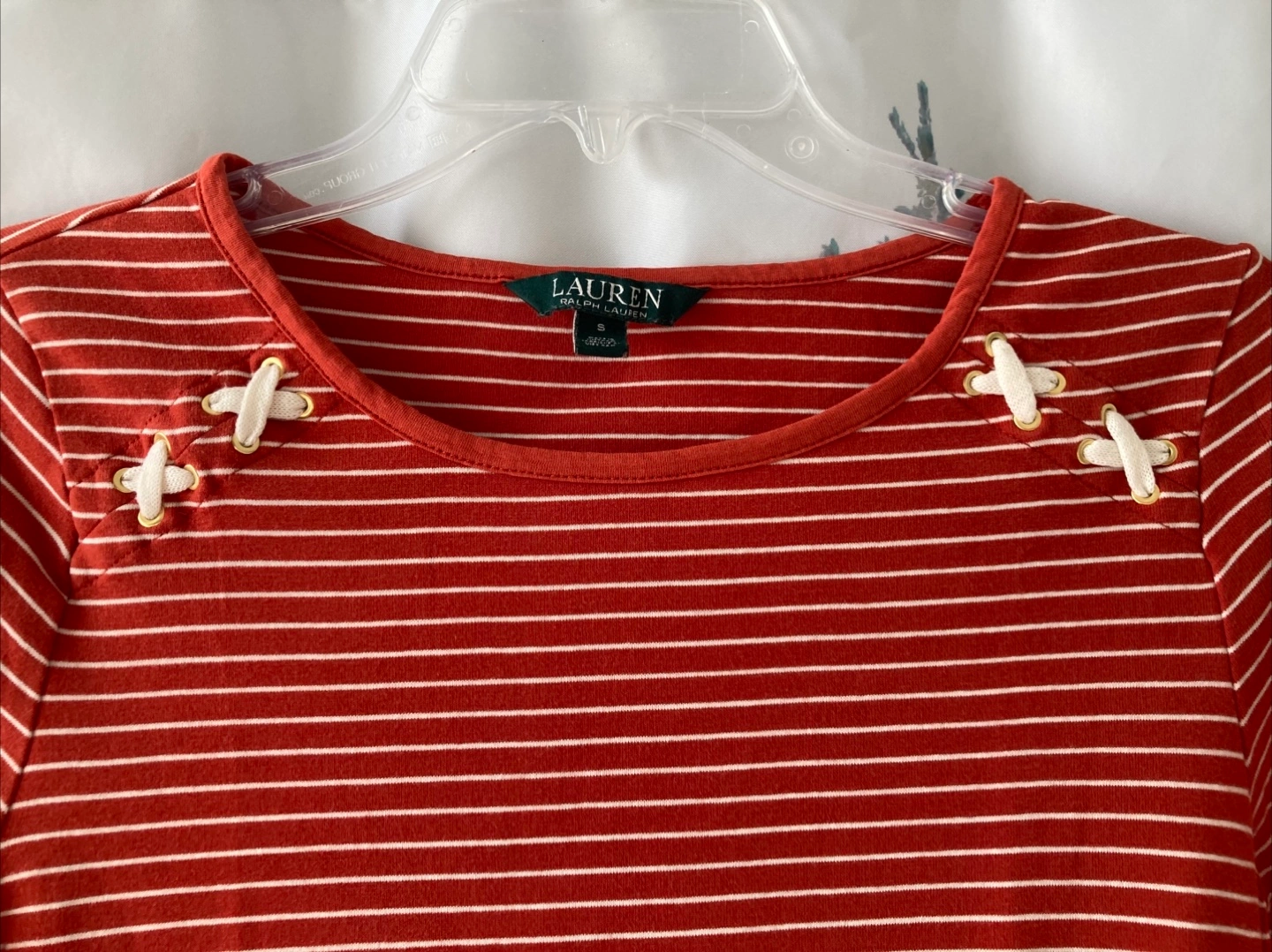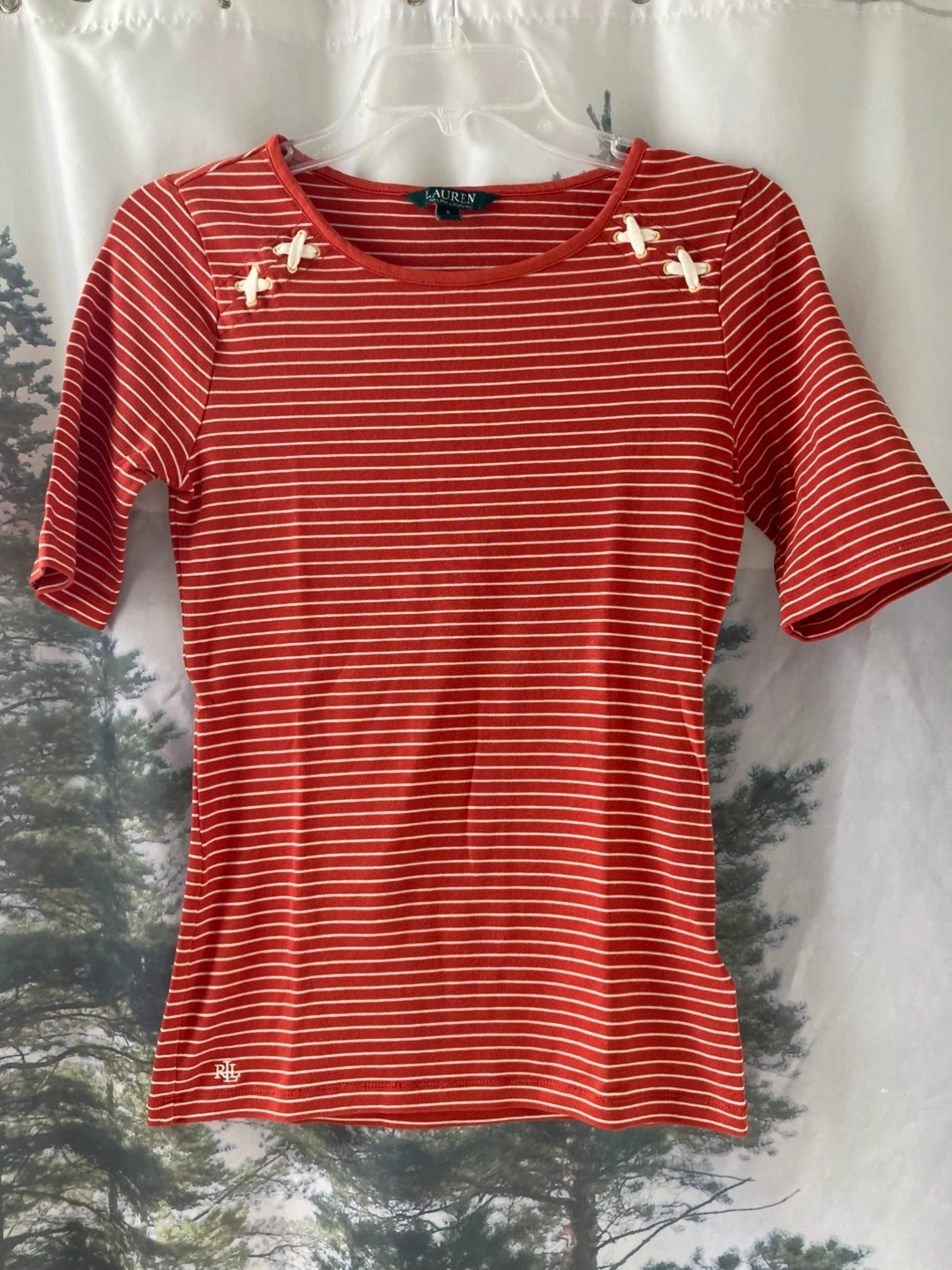 Here’s a cute Ralph Lauren top in size small! It features a striped pattern in a reddish-white colour, with a small 'RL' logo near the bottom. It has a round neckline and unique cross details on the shoulders. Has only been used a few times and is like new.