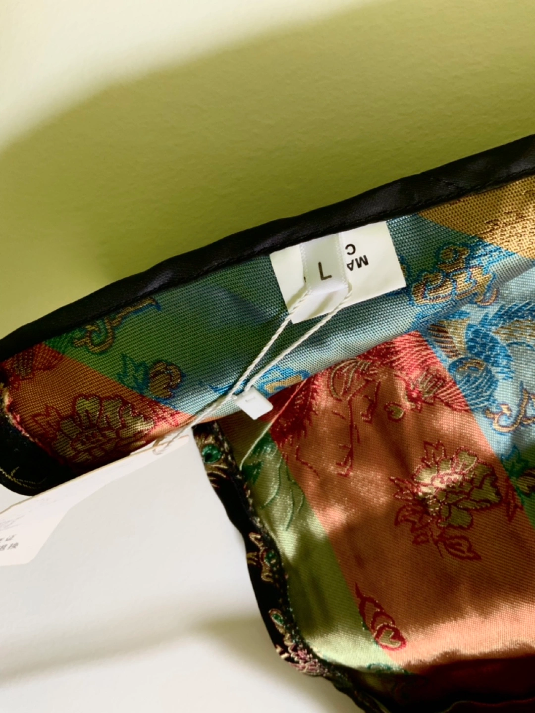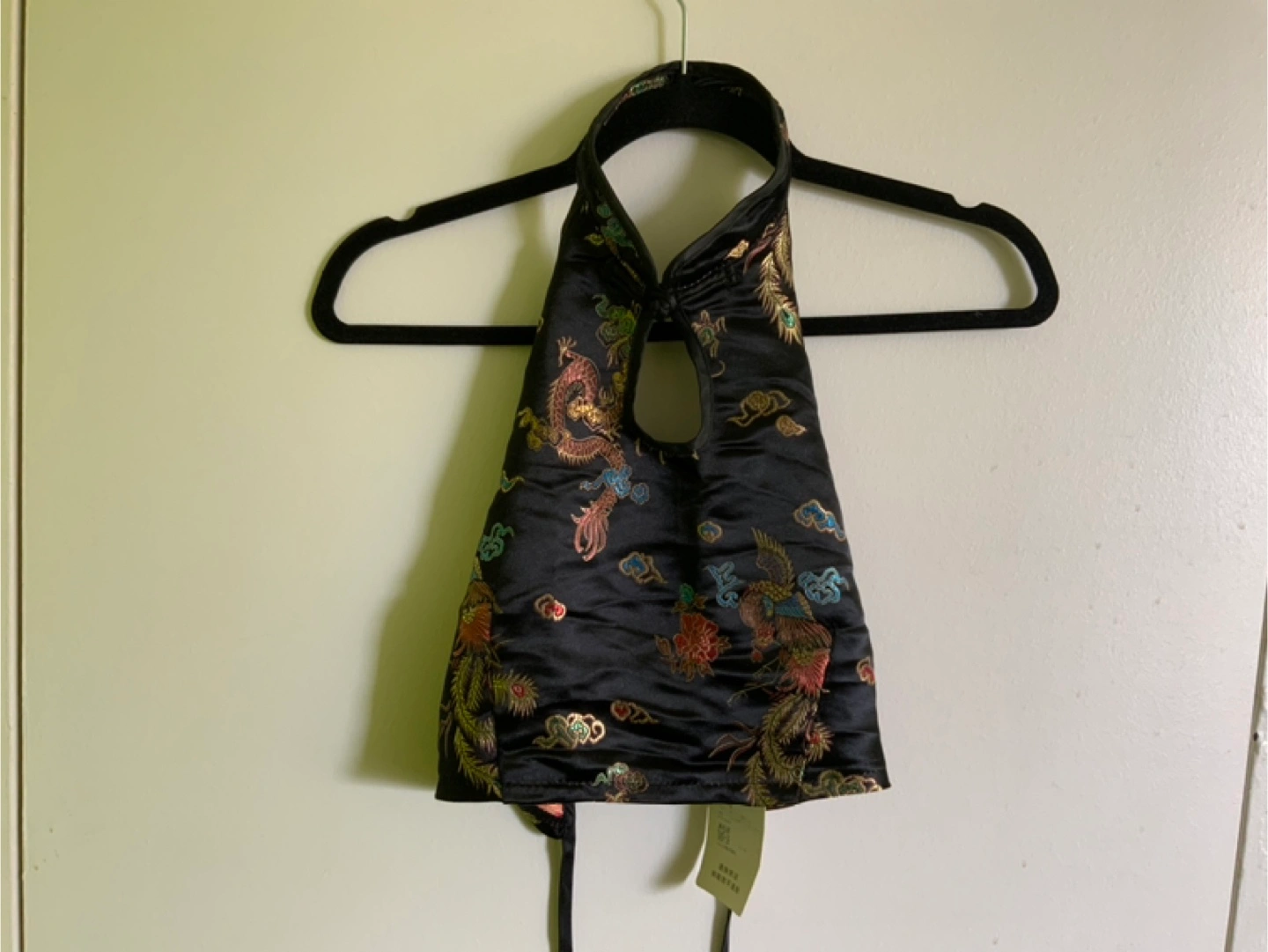 Black halter top with colourful dragon embroidery.
