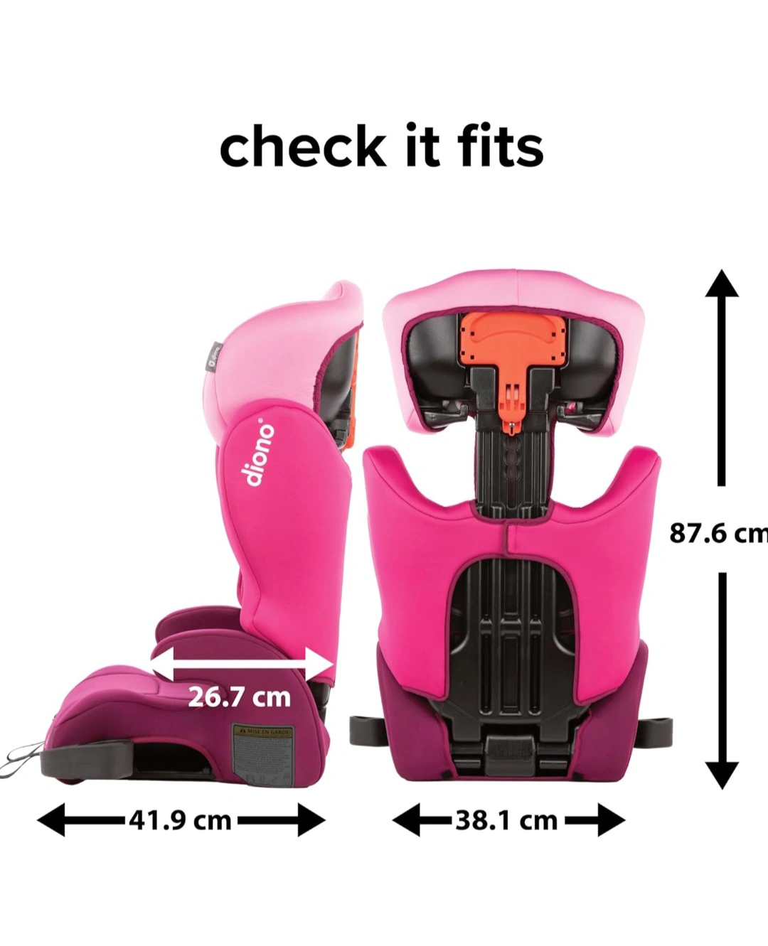 Selling a Diono safe+ 2-in-1 high-back booster car seat! This booster converts to a backless booster. It features a two-position headrest for added comfort and safety. The dimensions are: