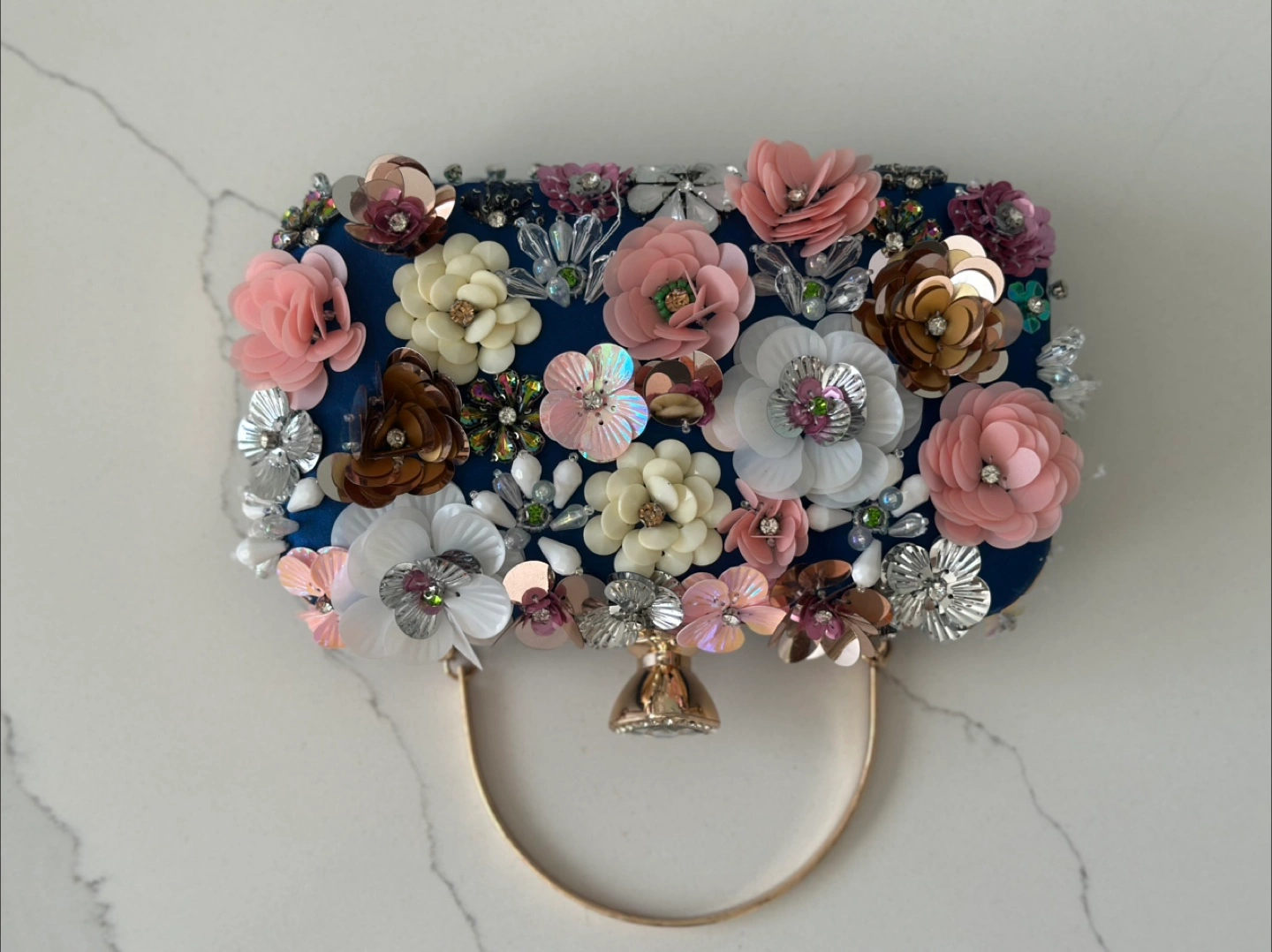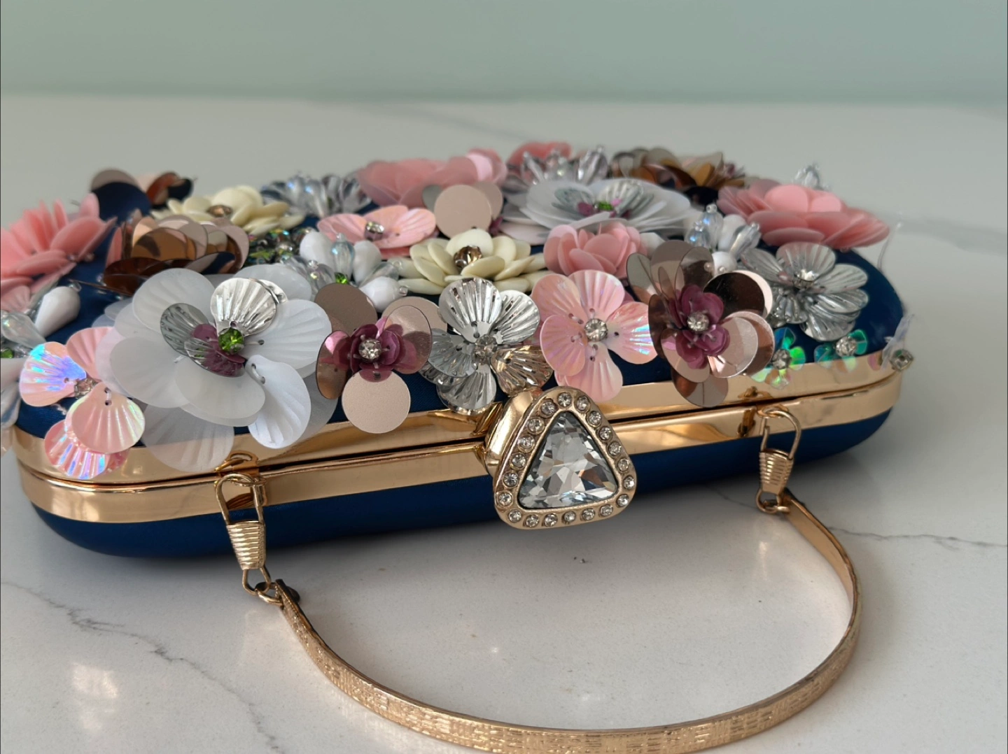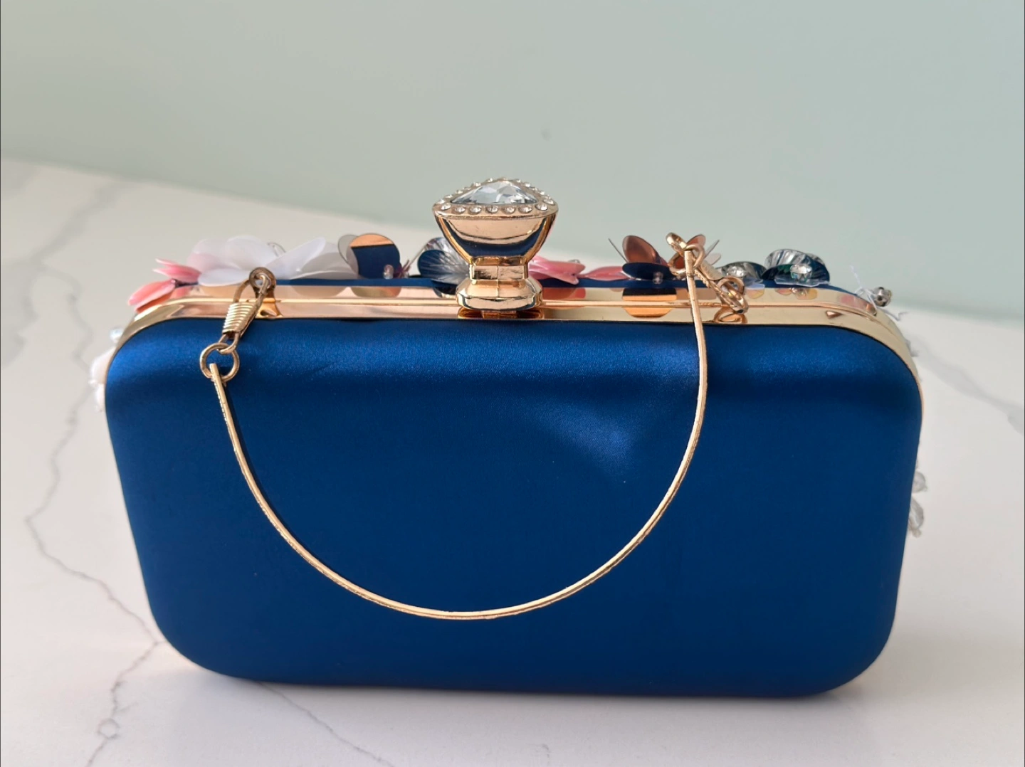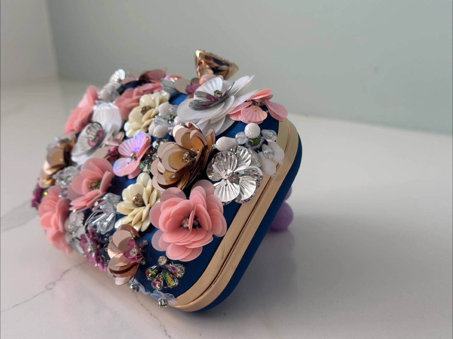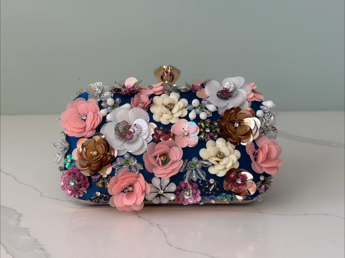 This is a beautiful evening clutch, perfect for a special occasion! It features a lovely floral embellishment with pink, white, and brown flowers and beads on a blue background. The clutch has a gold-tone frame and a detachable chain strap. It's in great condition and ready to add a touch of elegance to your outfit