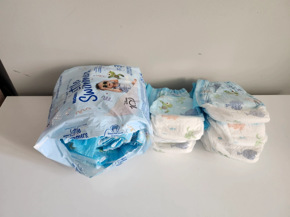 Open pack of Huggies Little Swimmers disposable swim pants, size 3. The pack contains 20 swim pants. Perfect for your little one's water adventures. #freecycle