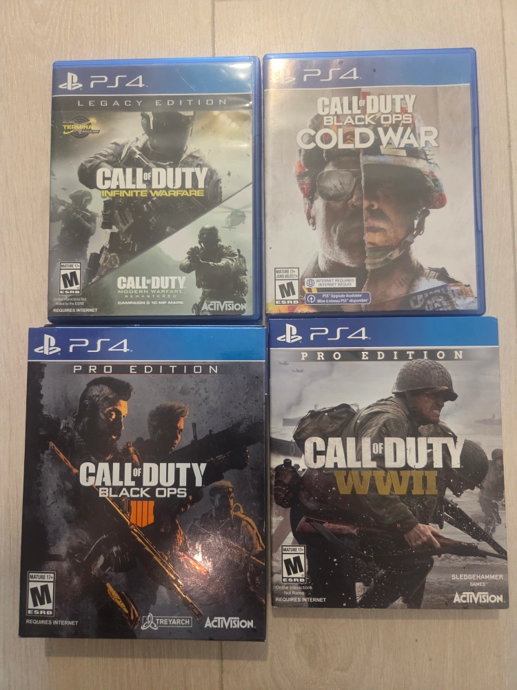 Selling a bundle of Call of Duty games for the PS4! Includes Infinite Warfare Legacy Edition, Black Ops Cold War, Black Ops Pro Edition, and WWII Pro Edition