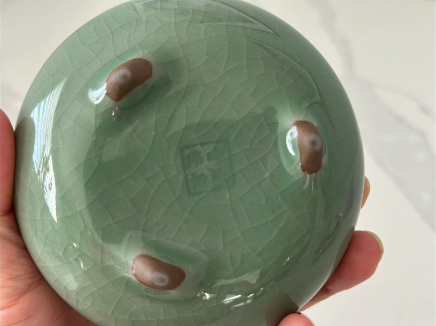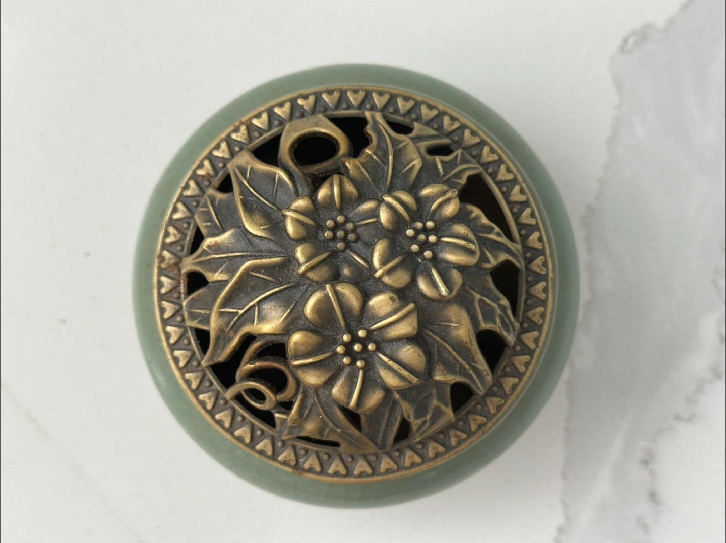 This is a lovely ceramic incense burner featuring a beautiful bronze floral design on top. It's in great condition and would be a wonderful addition to any home