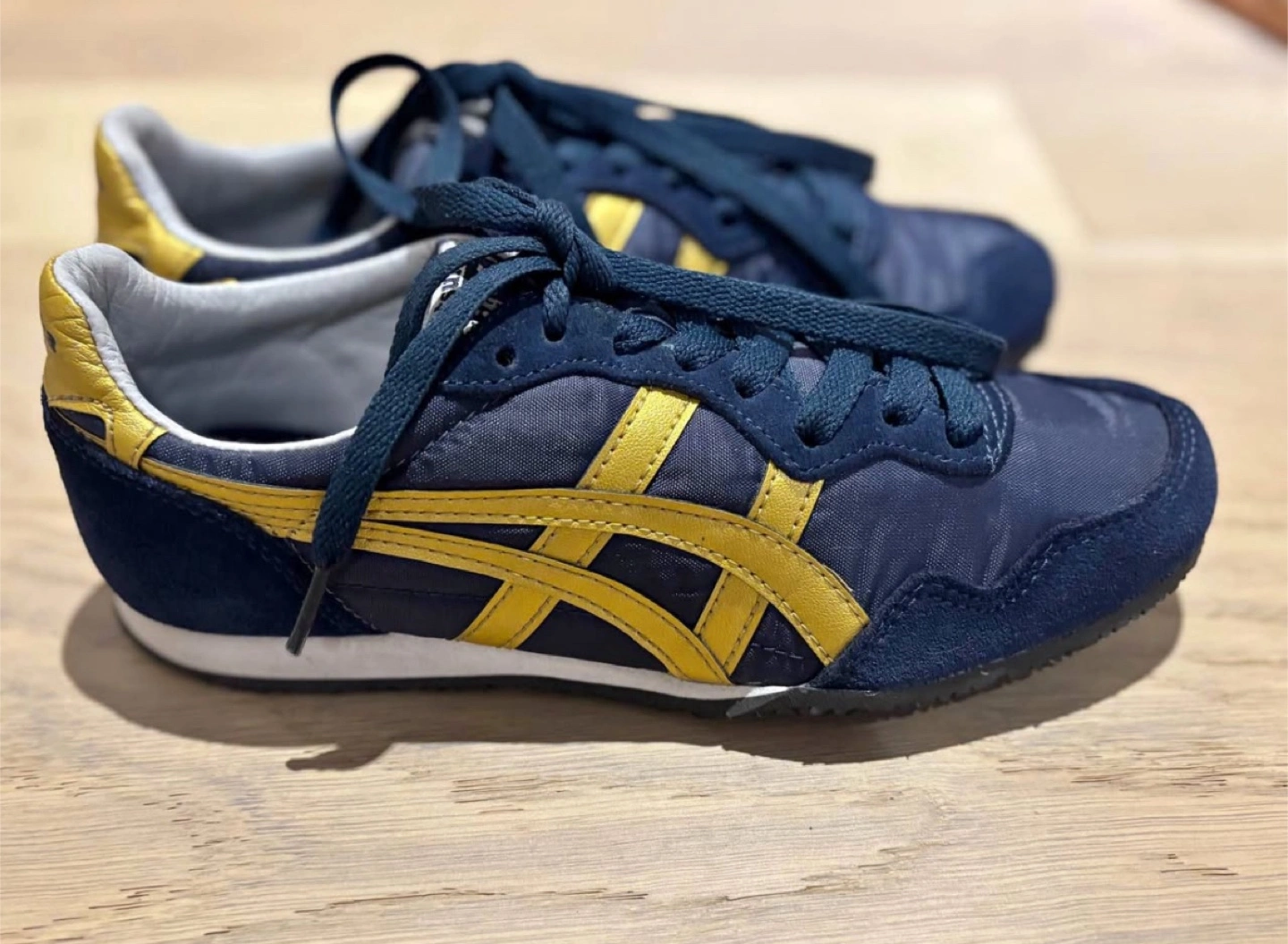 Selling a pair of Onitsuka Tiger sneakers in a stylish blue and gold colourway! They are in great condition and ready for a new home. Perfect for adding a touch of retro flair to your everyday look