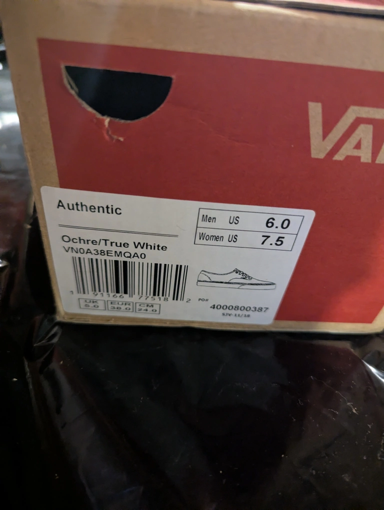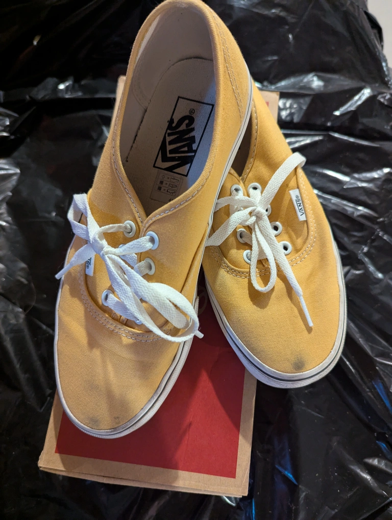 Selling a pair of Vans Authentic sneakers in Ochre/True White! They're a women's US size 7.5. The shoes are in good condition, just dirty and come with the original box. Wore it a couple times but my feet grew and can't fit it anymore. *cheaper because it's dirty