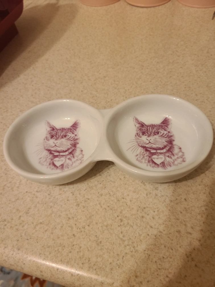 1000+A cute double cat bowl! It's made of white ceramic and features adorable cat illustrations in a purple/red colour. Perfect for feeding your furry friends! Giving away because when one bowl was empty my cats refused to eat out of the other.