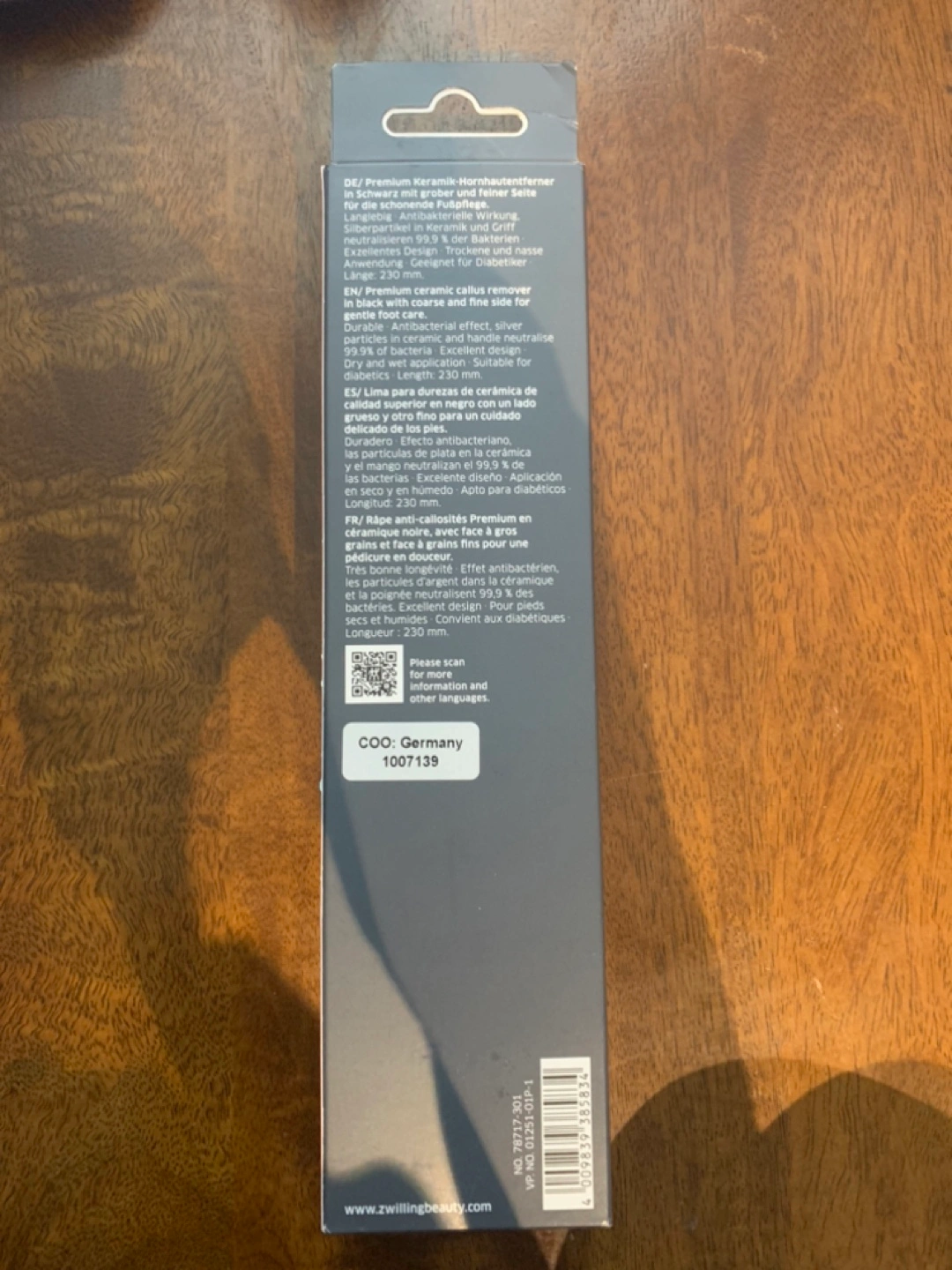 Selling a brand new Zwilling Premium Ceramic Callus Remover! It features a coarse and fine side for ergonomically perfect callus removal and has a durable antibacterial effect. Length: 230 mm. Comes in its original box!