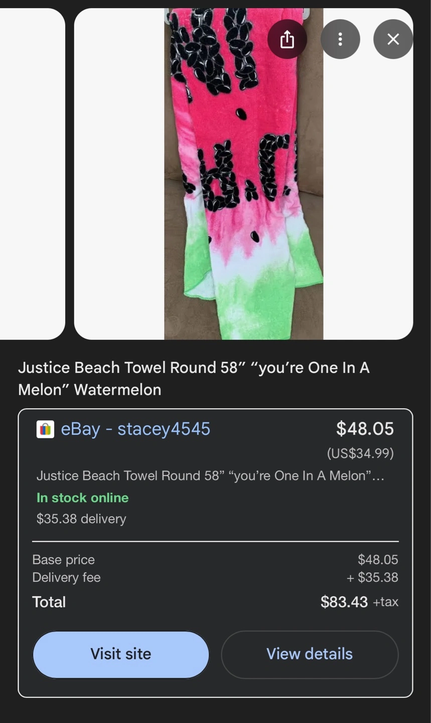 711New without tags, never used. Super cute, large 58” round beach towel. “You’re One In A Melon” — sold out print. Selling for $$$ online. Pick up from a smoke free home near Browns Line & Lakeshore Boulevard in Etobicoke (Toronto/Mississauga).