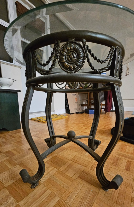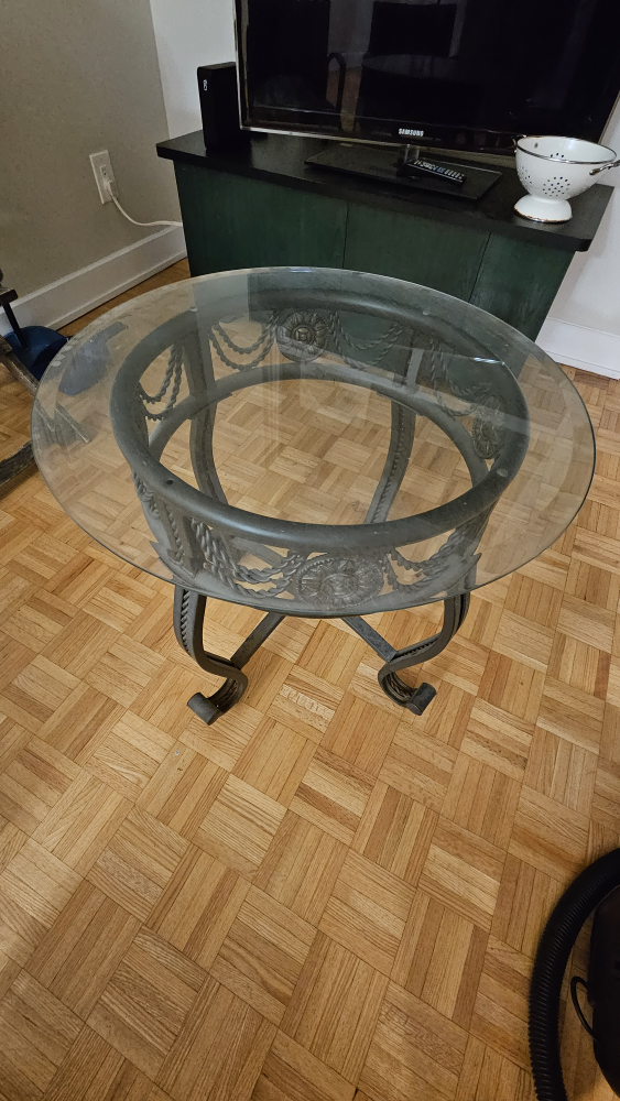 Selling a round glass top coffee table. It has a metal base with decorative details. It's in good condition.