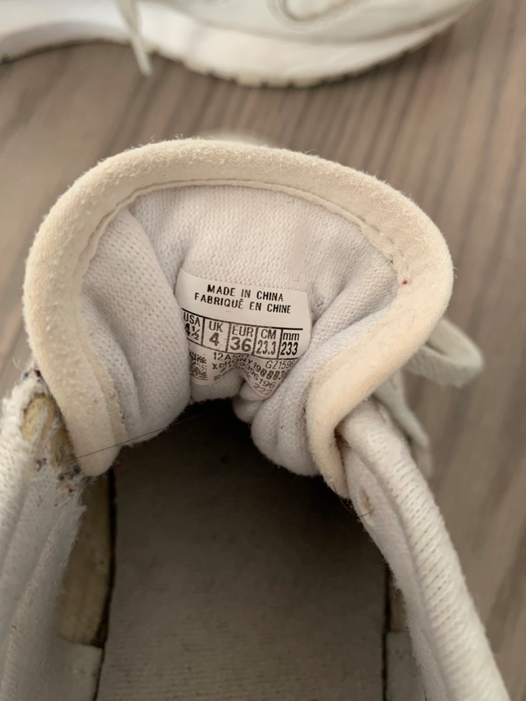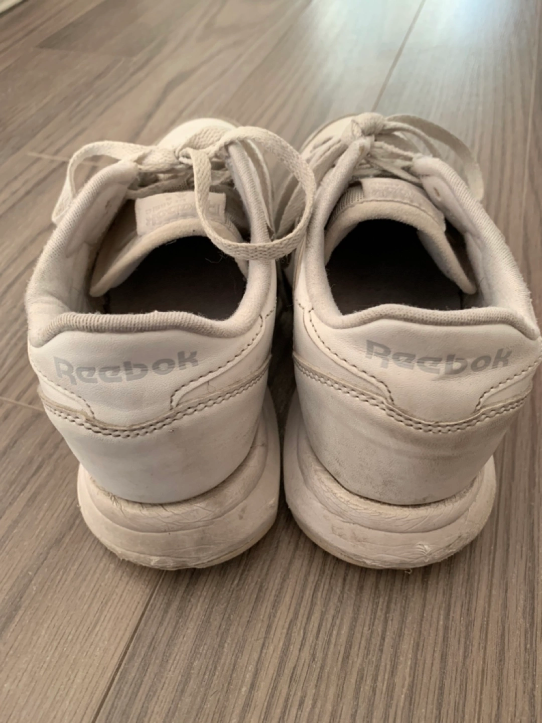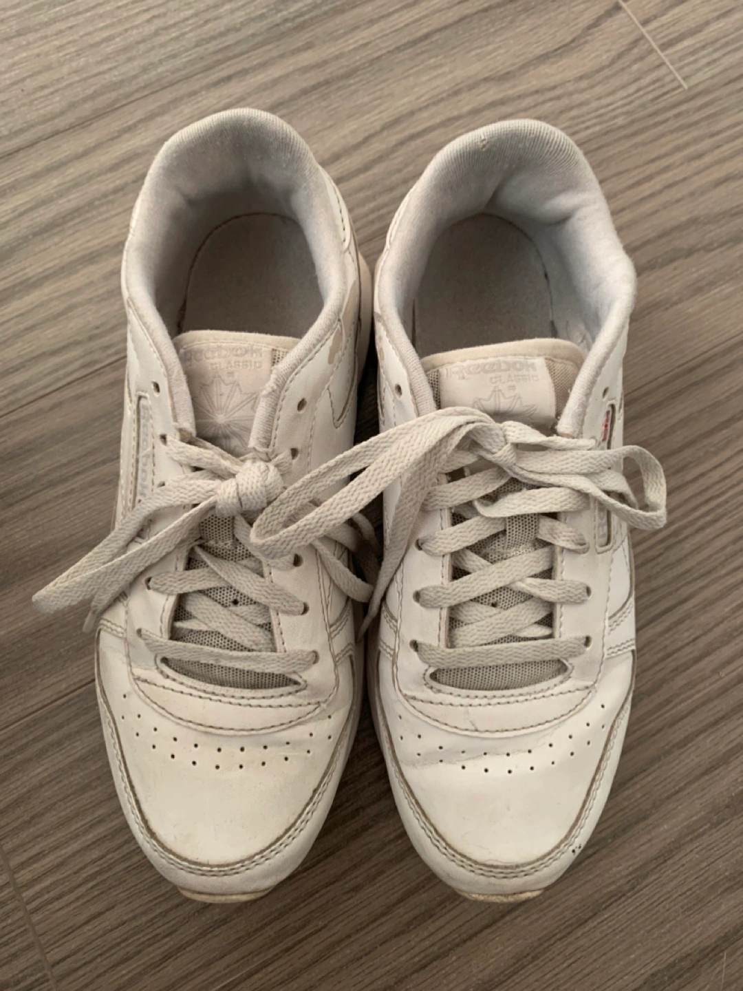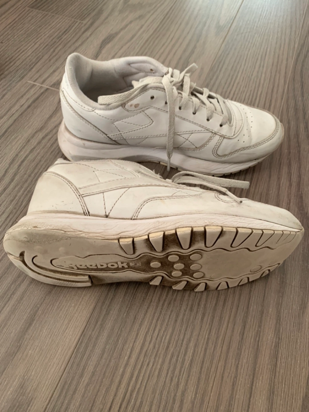 Reebok Classic Leather sneakers in white. Condition is used and worn (please see photos) but there’s still some life in them. If you need a beater pair or ones you can use a few times roughly and toss (to walk in muddy places or if you’re painting) then these are for you! The size is US Women’s size 6 (or Men 4.5) UK 4, EUR 36, and 23.3cm. Pick up near Spadina Ave & Front St W