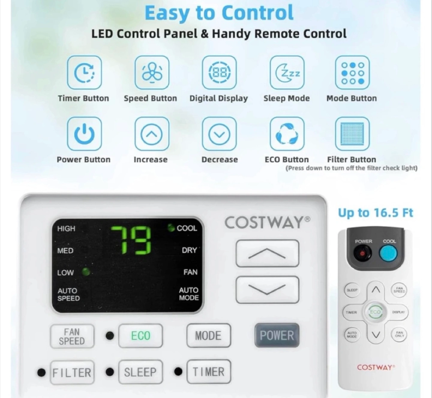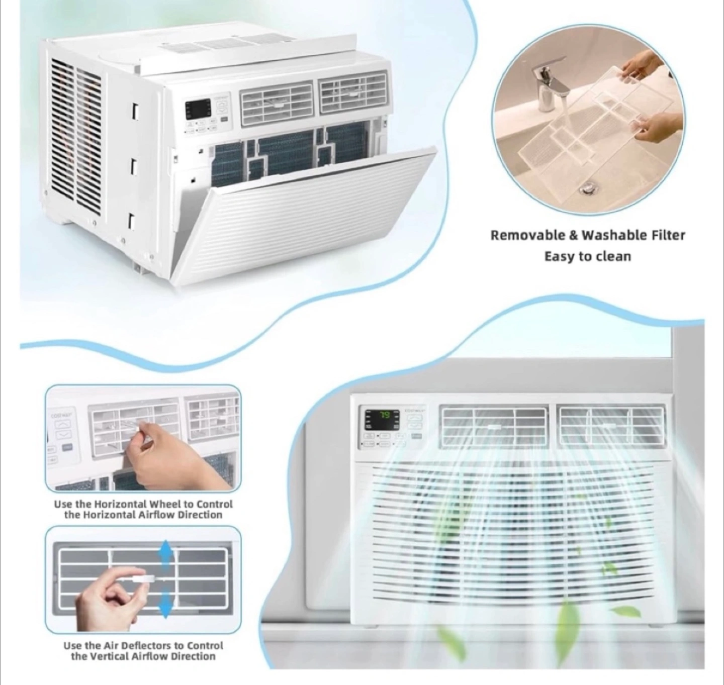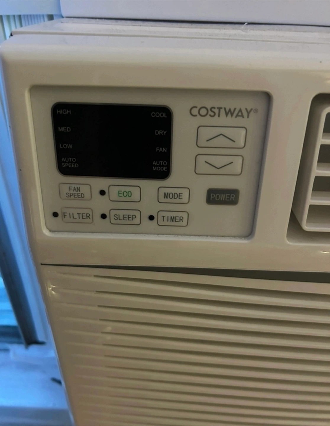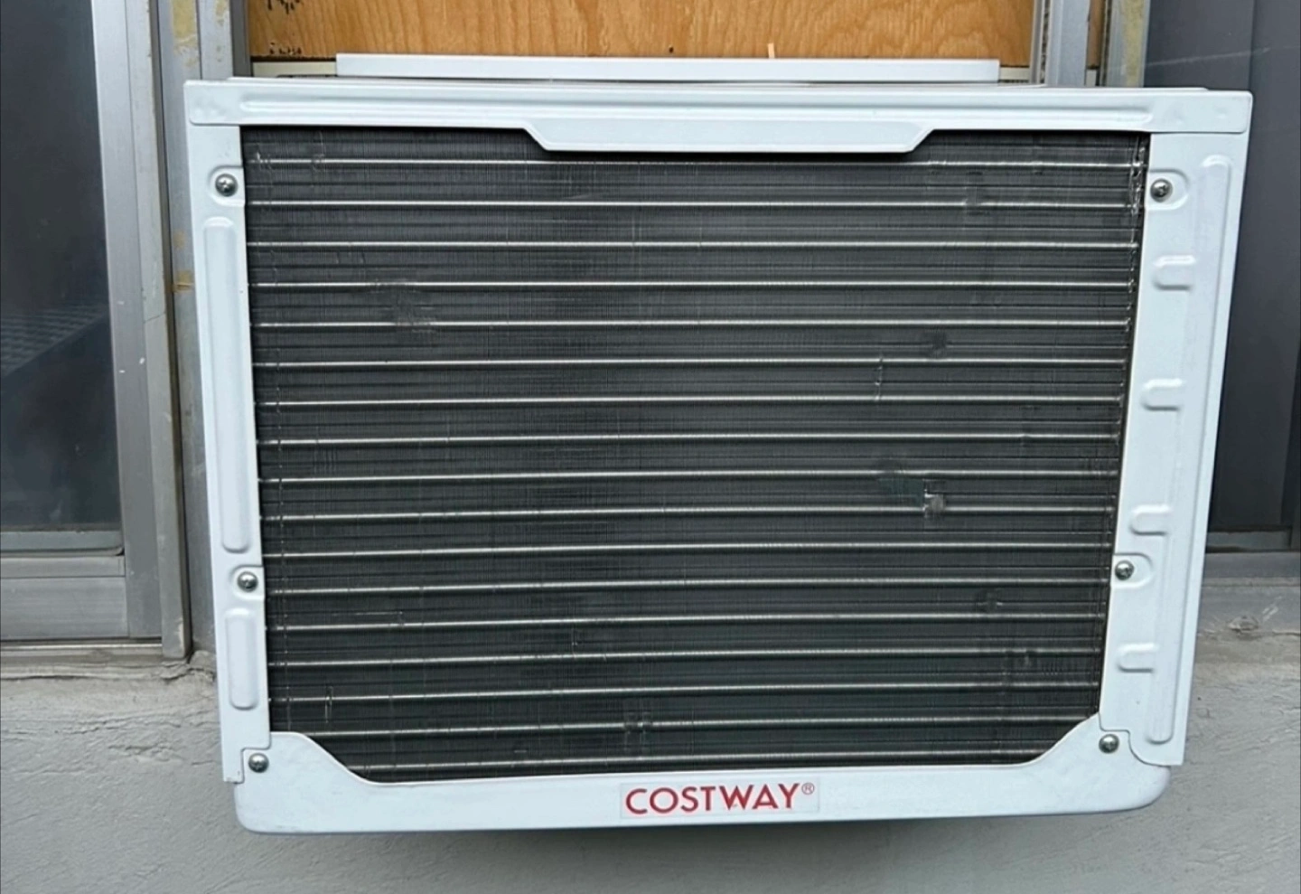 Selling a Costway window air conditioner. It's an energy-efficient 10000 BTU unit that cools rooms up to 450 sq ft. It features a quiet electronic window AC with cool dry fan auto mode, 4-way air flow, and a 24-hour timer. Comes with a remote control and black cover. Cash & pickup only!