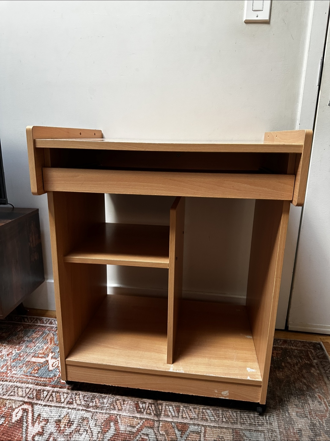 Selling a wooden desk with shelves and wheels! It's in good condition and perfect for a small space. There are a few minor scuffs, but overall it's very sturdy and functional. Great for a student or anyone needing a compact workspace.