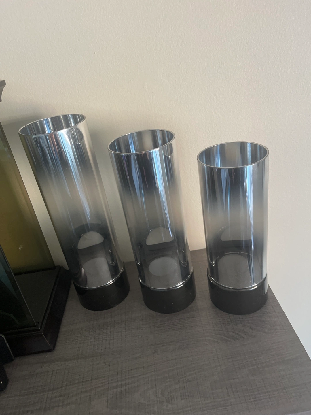 Selling a set of three glass candle holders! They have a sleek, modern design with a black base and a gradient smoky grey glass. They'd look great on a mantle or as a table centrepiece. Pick up only