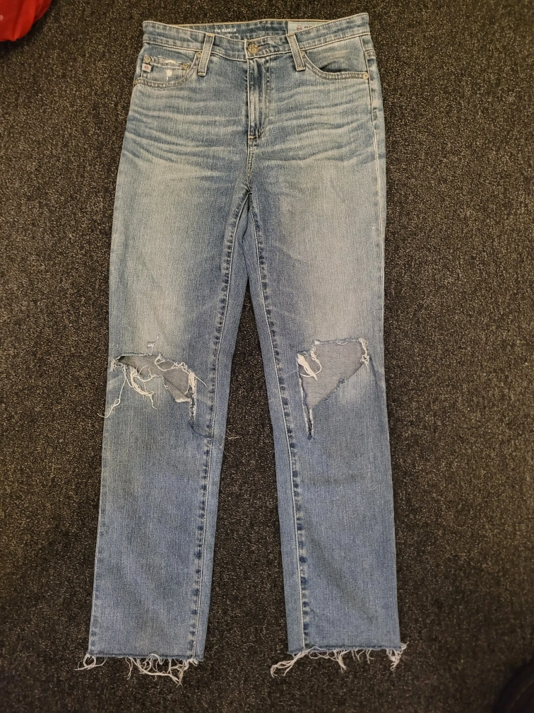 1000+Selling a pair of AG-ed Denim Adriano Goldschmied jeans! They are a size 25R and made of 98% cotton and 2% polyurethane. They have a distressed look with rips in the knees and pockets. **** Pickup Only **** **** No E-transfers **** **** Cash Only **** **** Serious Inquiries Only/ Serious Offers Only ****