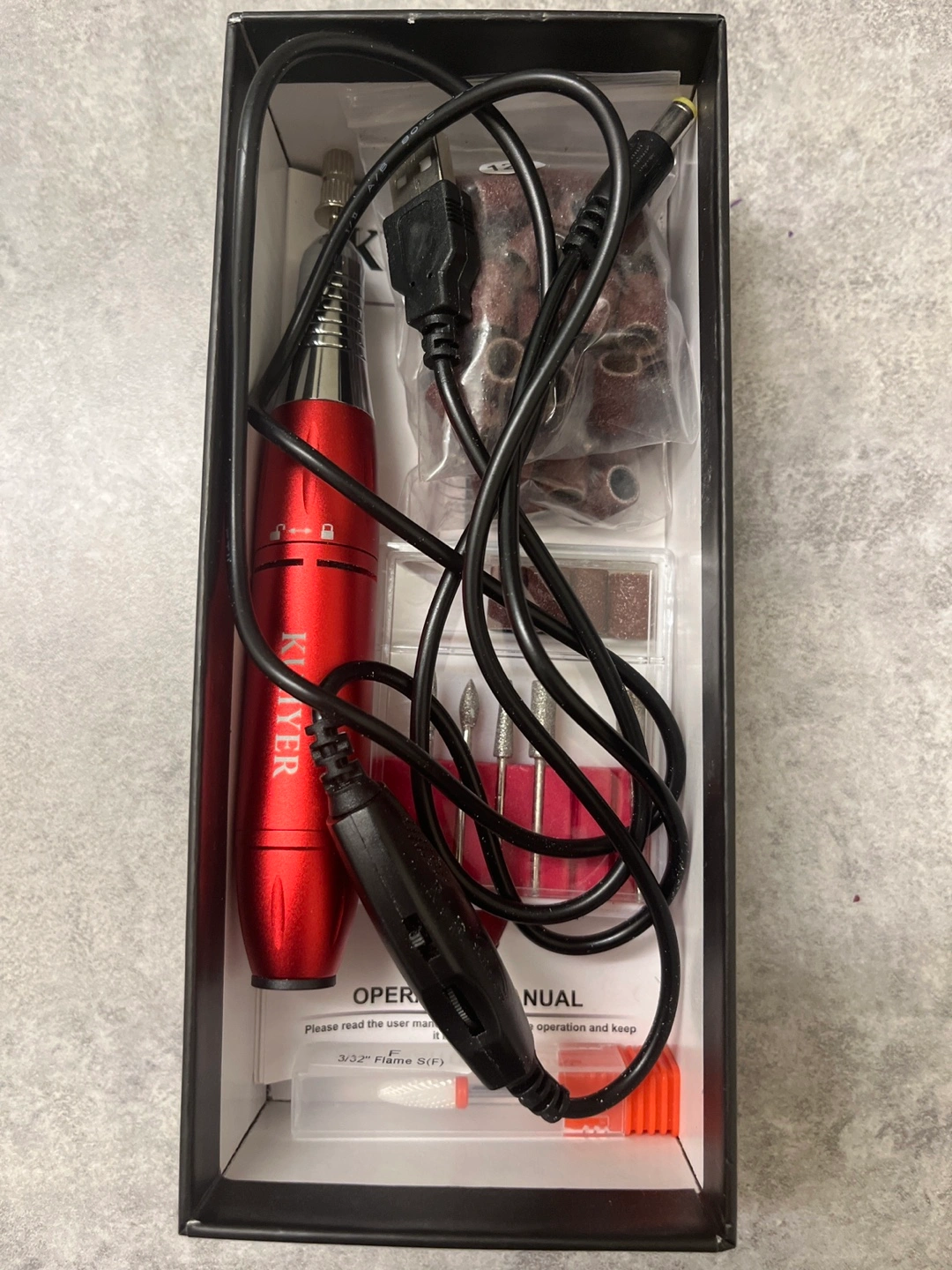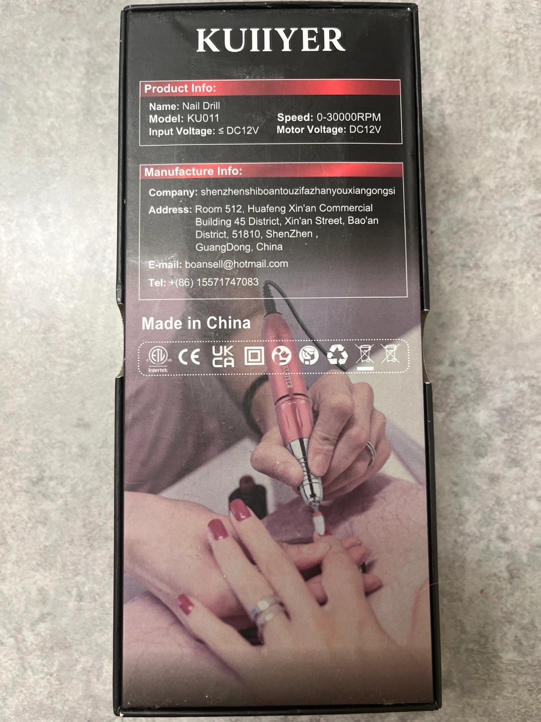Selling a KUIYER Nail Drill, model KU011. It comes with all the components in the original box. The drill has a speed of 0-30000RPM and operates on a motor voltage of DC12V. Perfect for your nail care needs! Pick up only