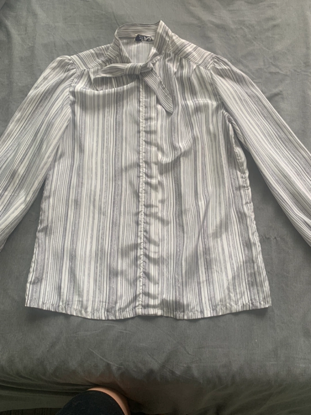 Elegant striped blouse with a tie-neck detail. The material is lightweight and comfortable - though I know cause I can’t read the material tag.