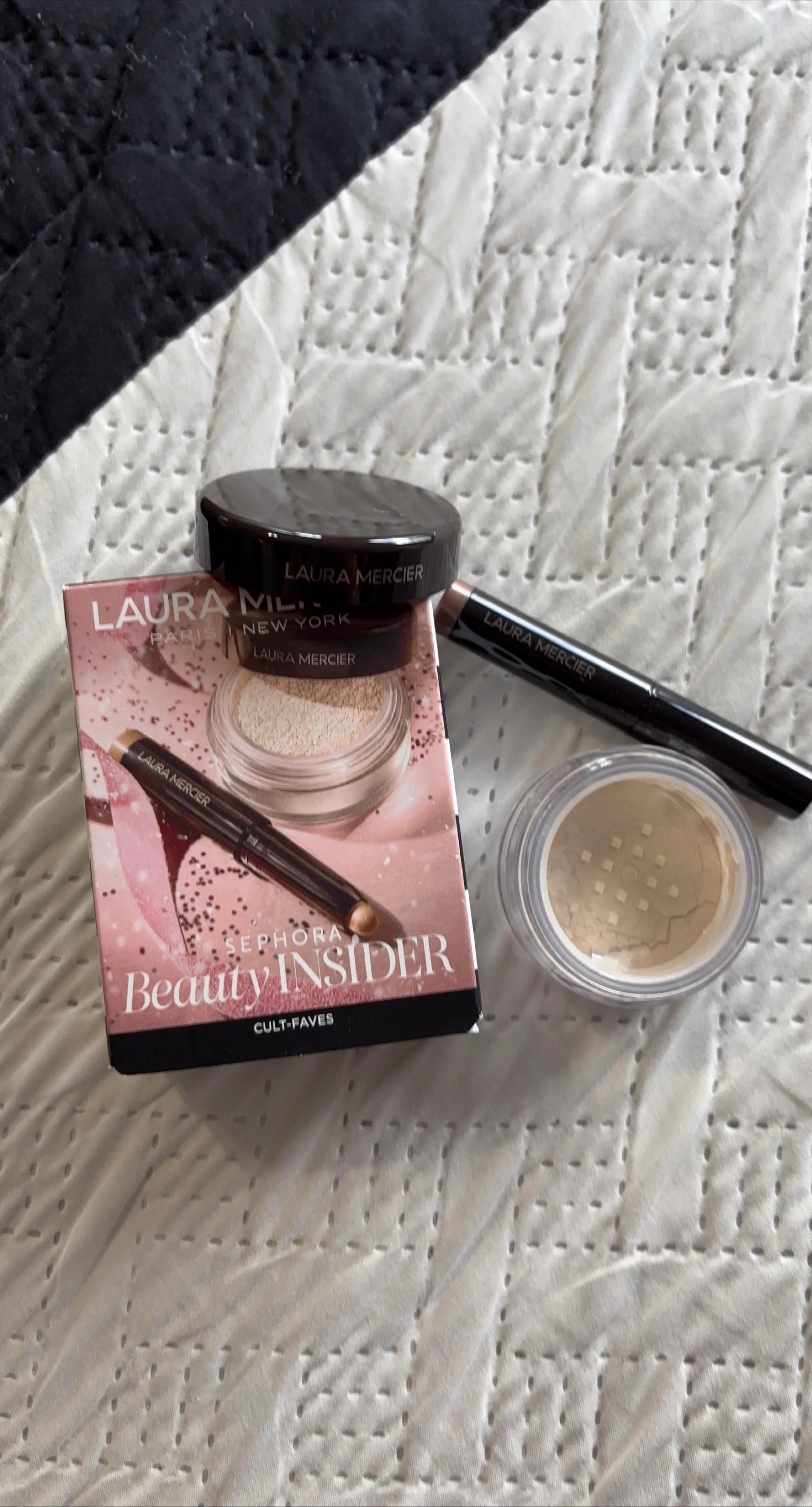 Laura Mercier Beauty Insider Cult-Faves set. It includes a translucent loose setting powder and a strapless caviar stick eye colour. Great for anyone looking to try out some popular Laura Mercier products!