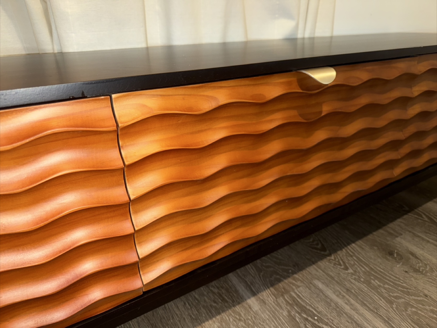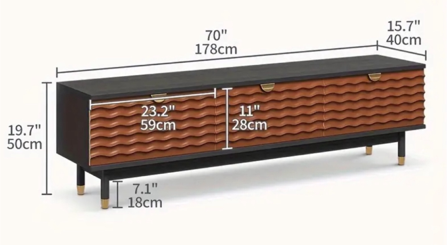 Selling a Brand New Hernest 3 drawer TV console, black painted solid wood body in eggshell finish, walnut finish carved wood doorfront. Size 70”L x 15.7”D x 19.7” H (leg height 7”) (additional one brand new still in package, came as one piece, only need to assemble the legs and handles)