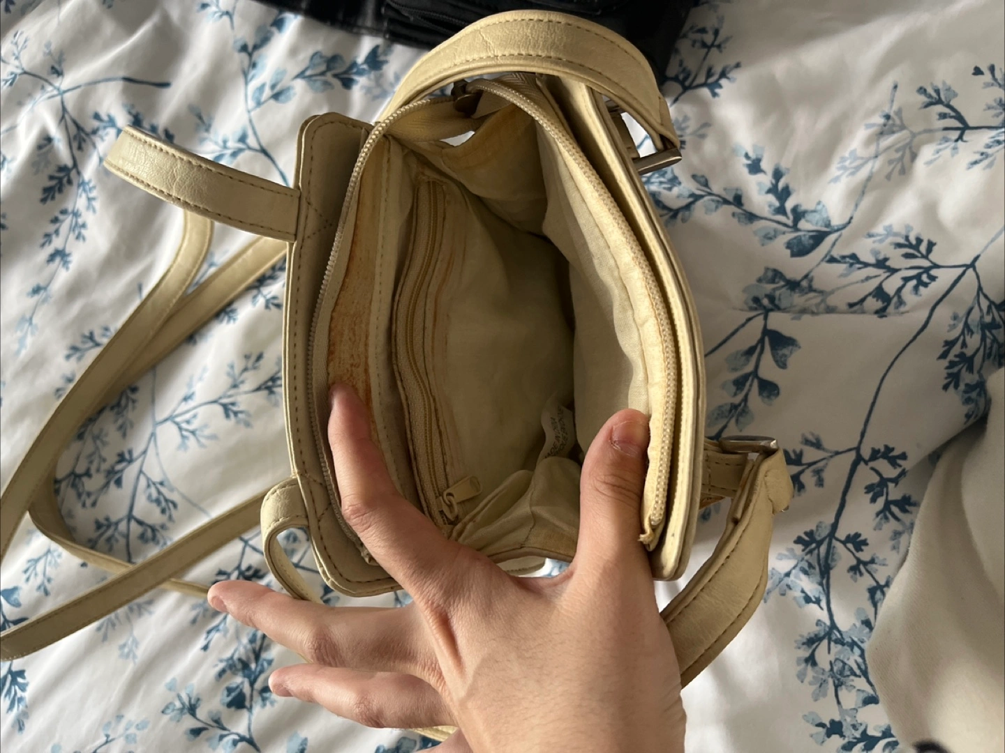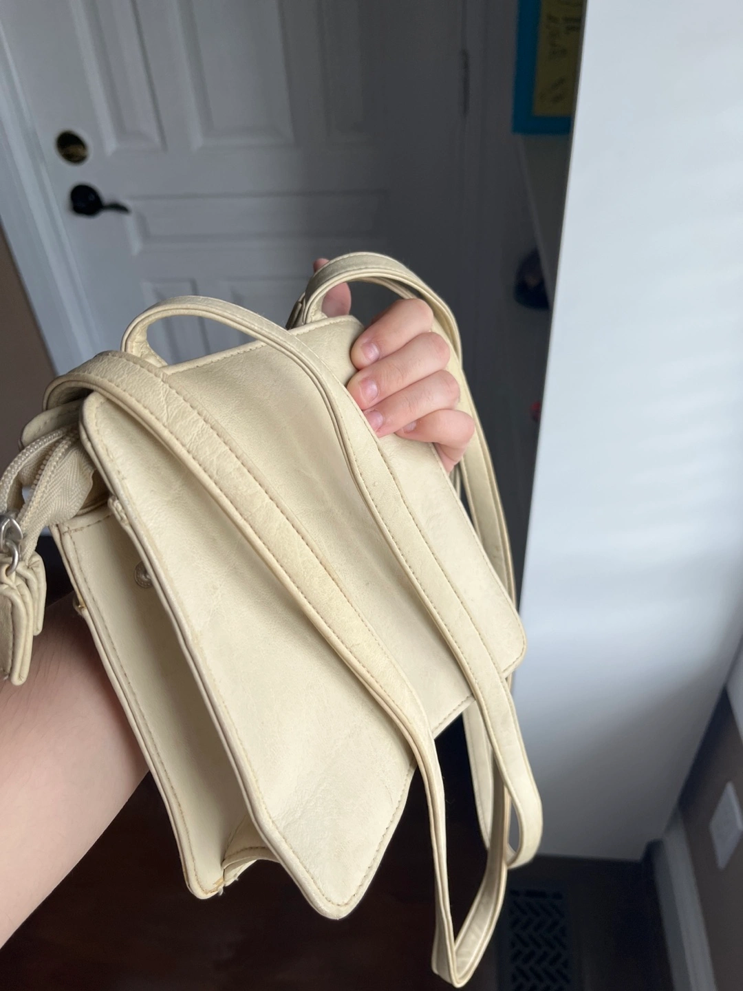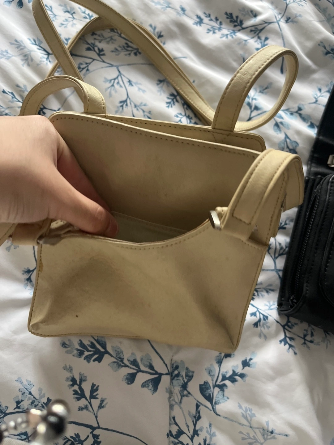 Selling a beige shoulder bag. It's in used condition, as shown in photos in the first photo is looks yellow but it isn’t it is more of a white colour I tried to get a picture in better lighting