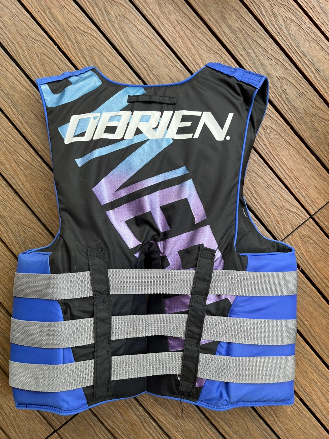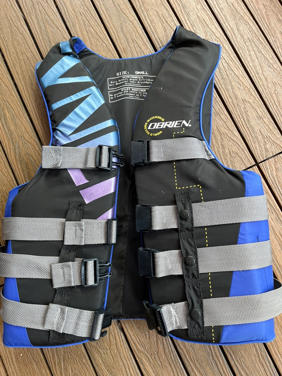 This is an O'Brien waterski life jacket in size small. It features a sturdy nylon exterior for wear and durability, designed to fit snugly for your safety. Its minimal bulk design allows full mobility and easy on and off. The anatomically cut lightweight foam flotation with a durable outer shell makes the life jacket durable, soft, and comfortable. It also has 4 heavy-duty wide webbing belts with quick-release buckles for an adjustable fit and easy fastening