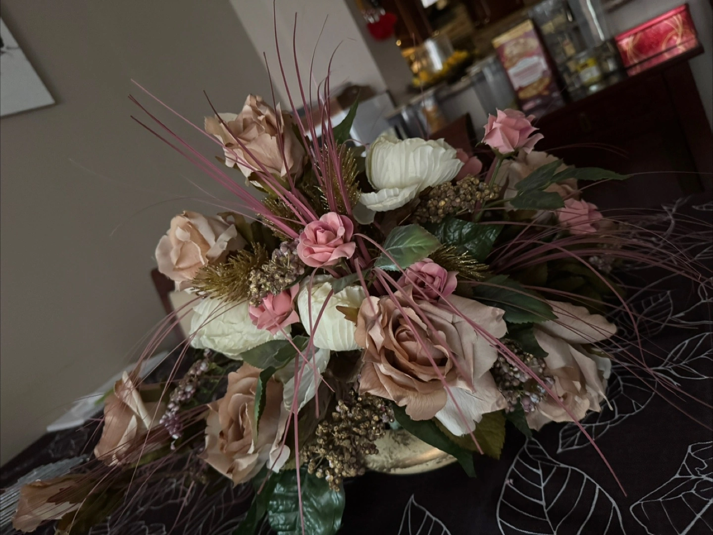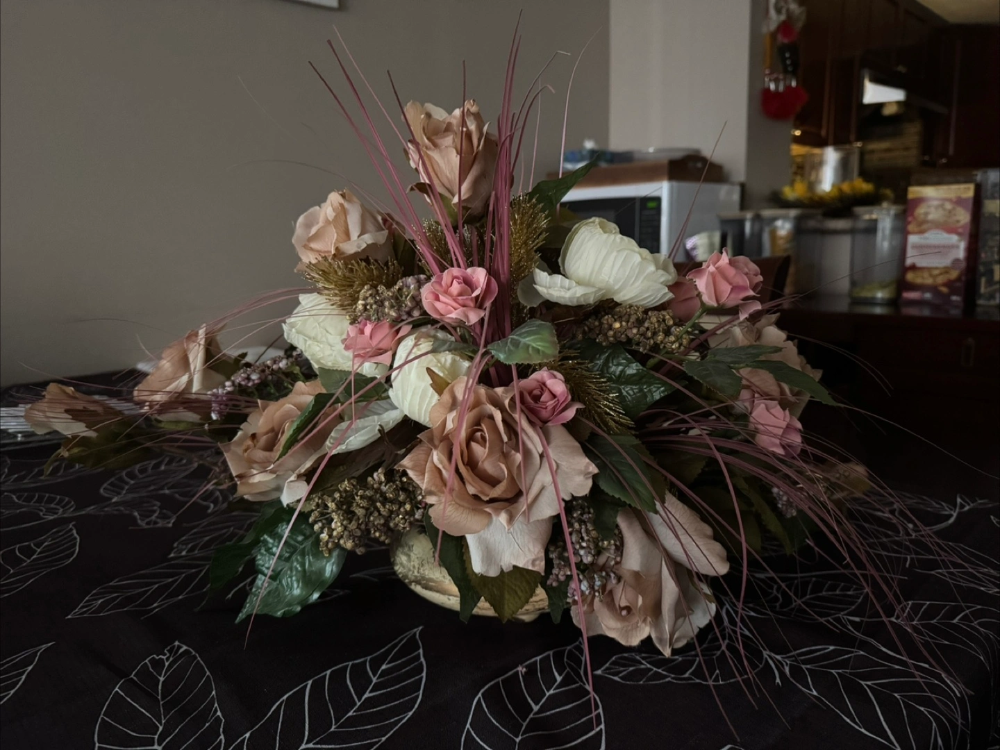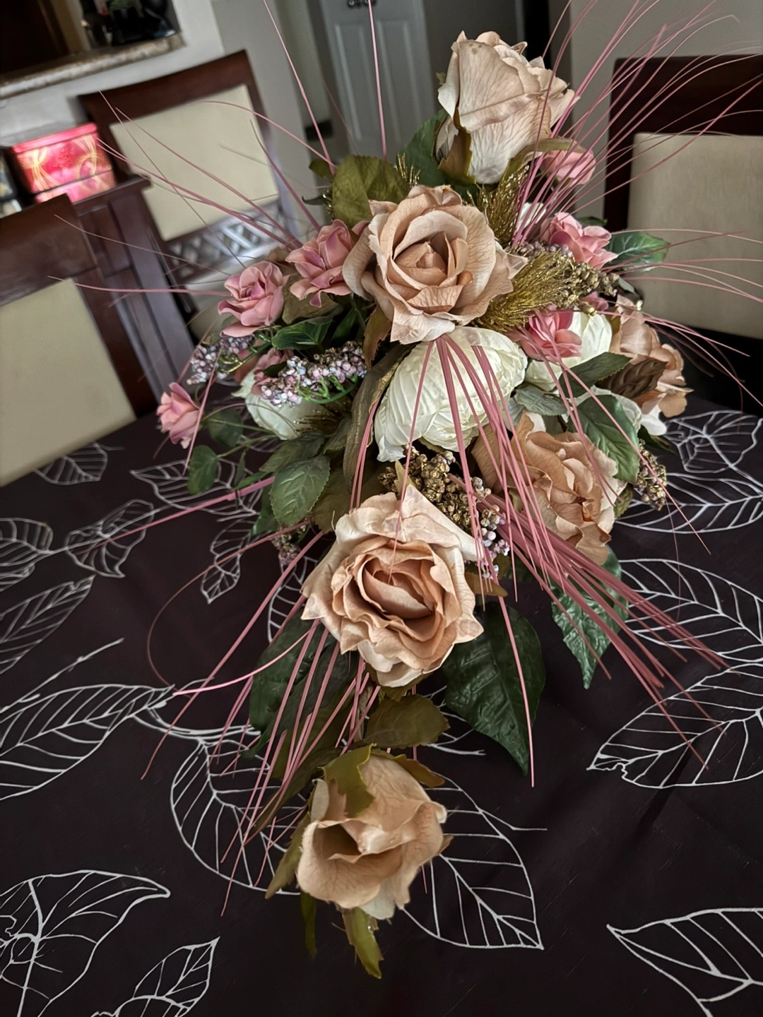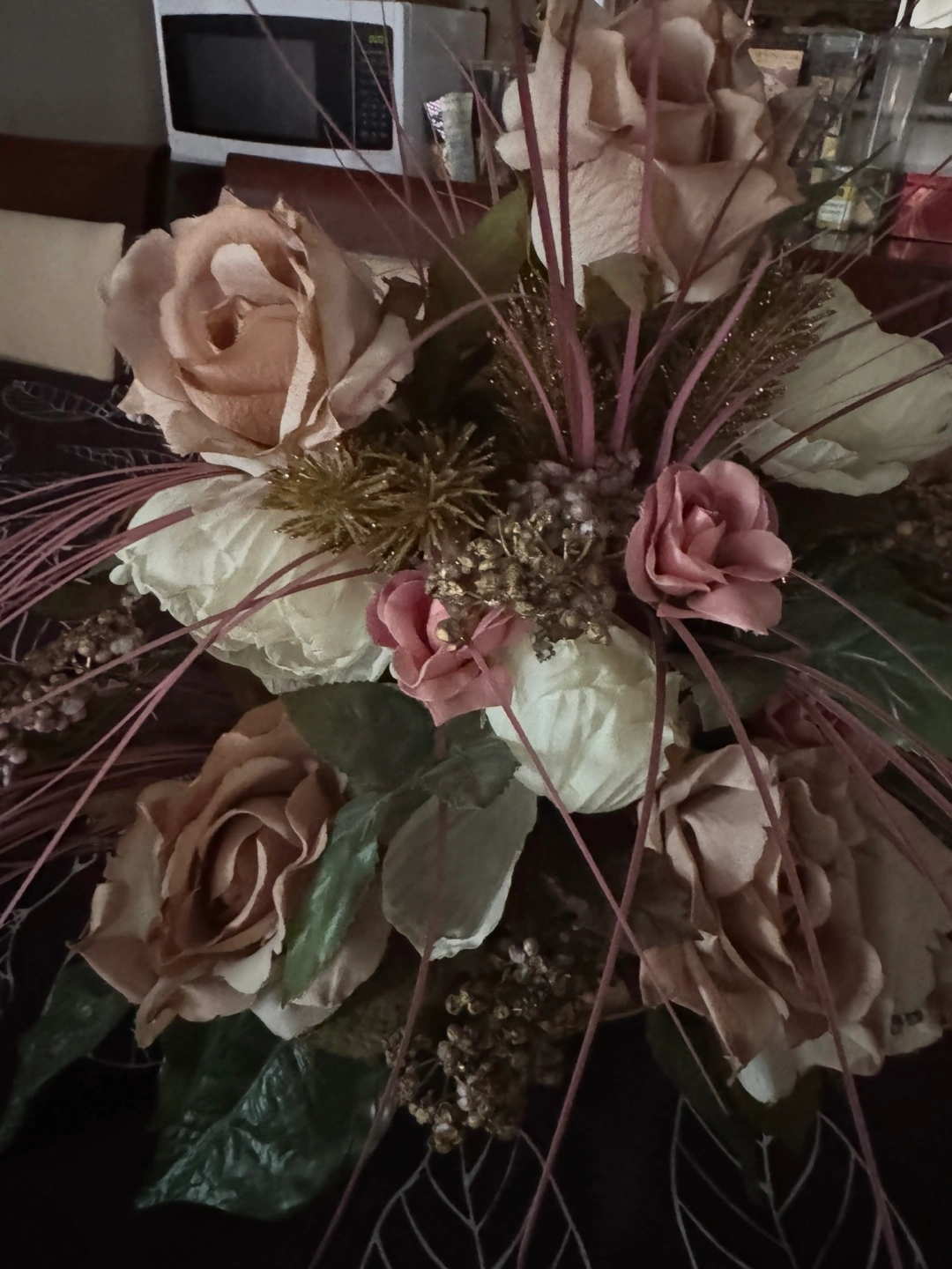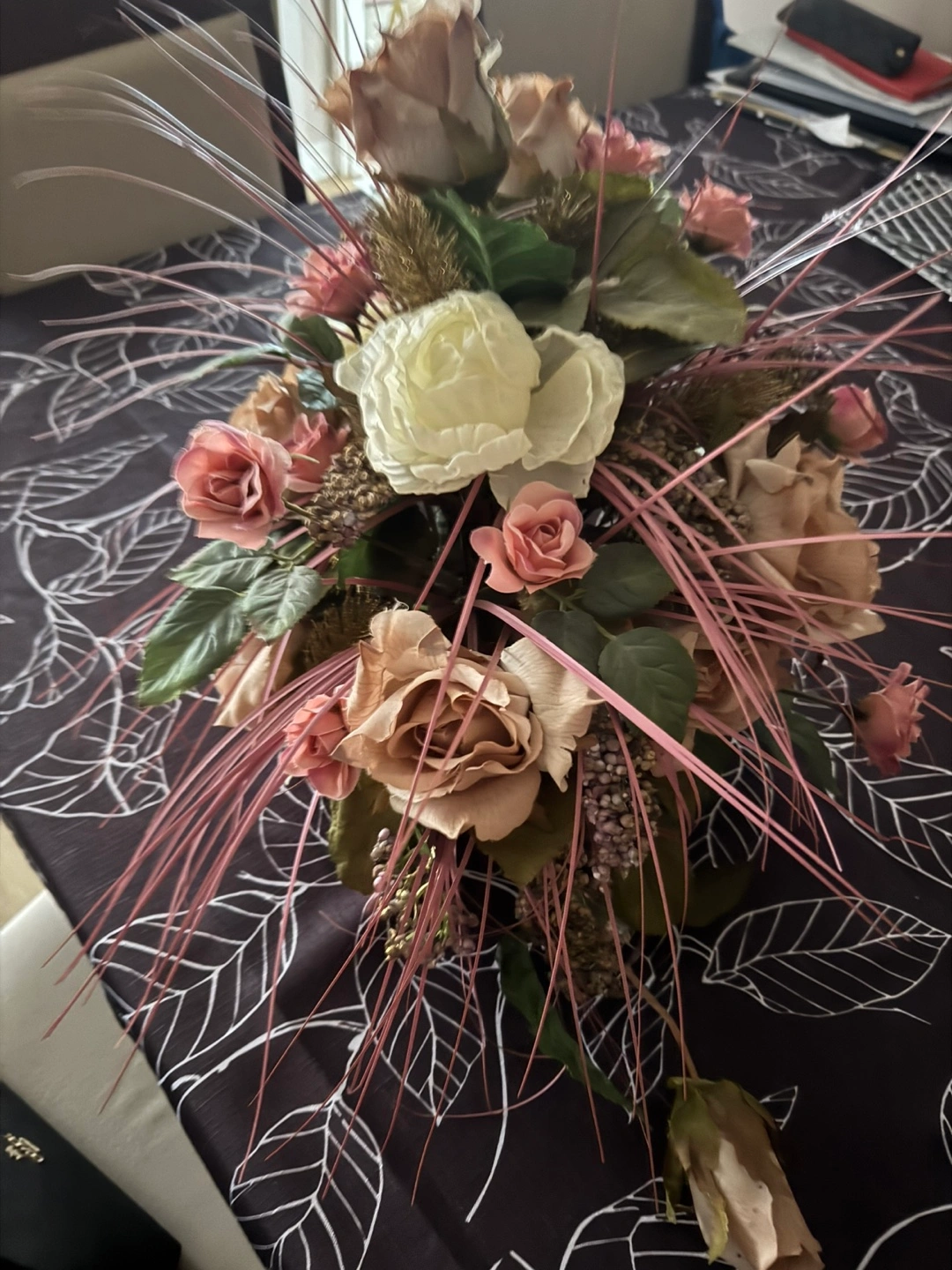 Selling a beautiful floral arrangement featuring roses and other lovely flowers! It's in great condition and would look lovely in any room of your home