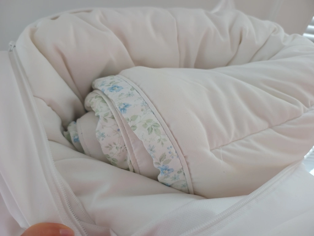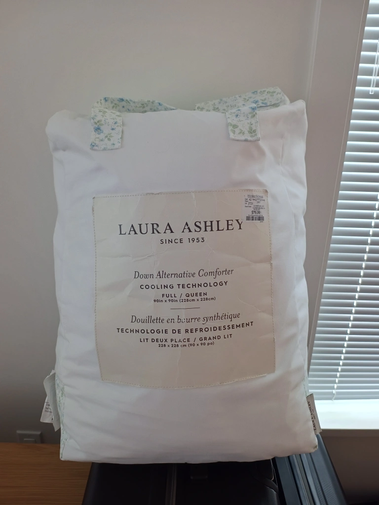 For free - an used comforter Laura Ashley. It's a full/queen size, measuring 90in x 90in (228cm x 228cm). It's designed with cooling technology and is made with a synthetic down filling. Originally bought for $79.99