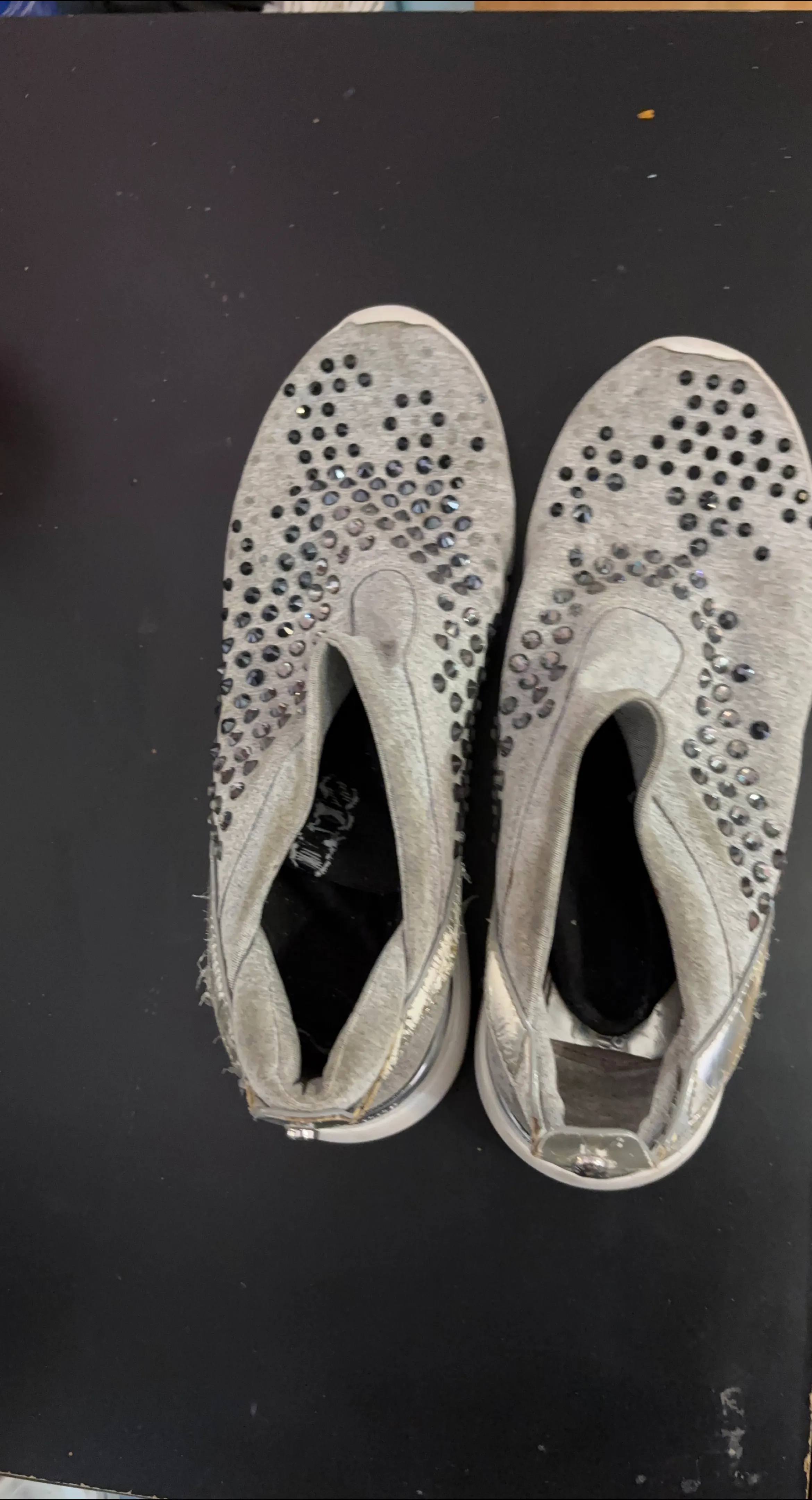 Selling a pair of L.A.M.B. slip-on shoes in gray. They feature embellishments on the upper part of the shoe. Perfect for adding a bit of sparkle to your casual outfits!
