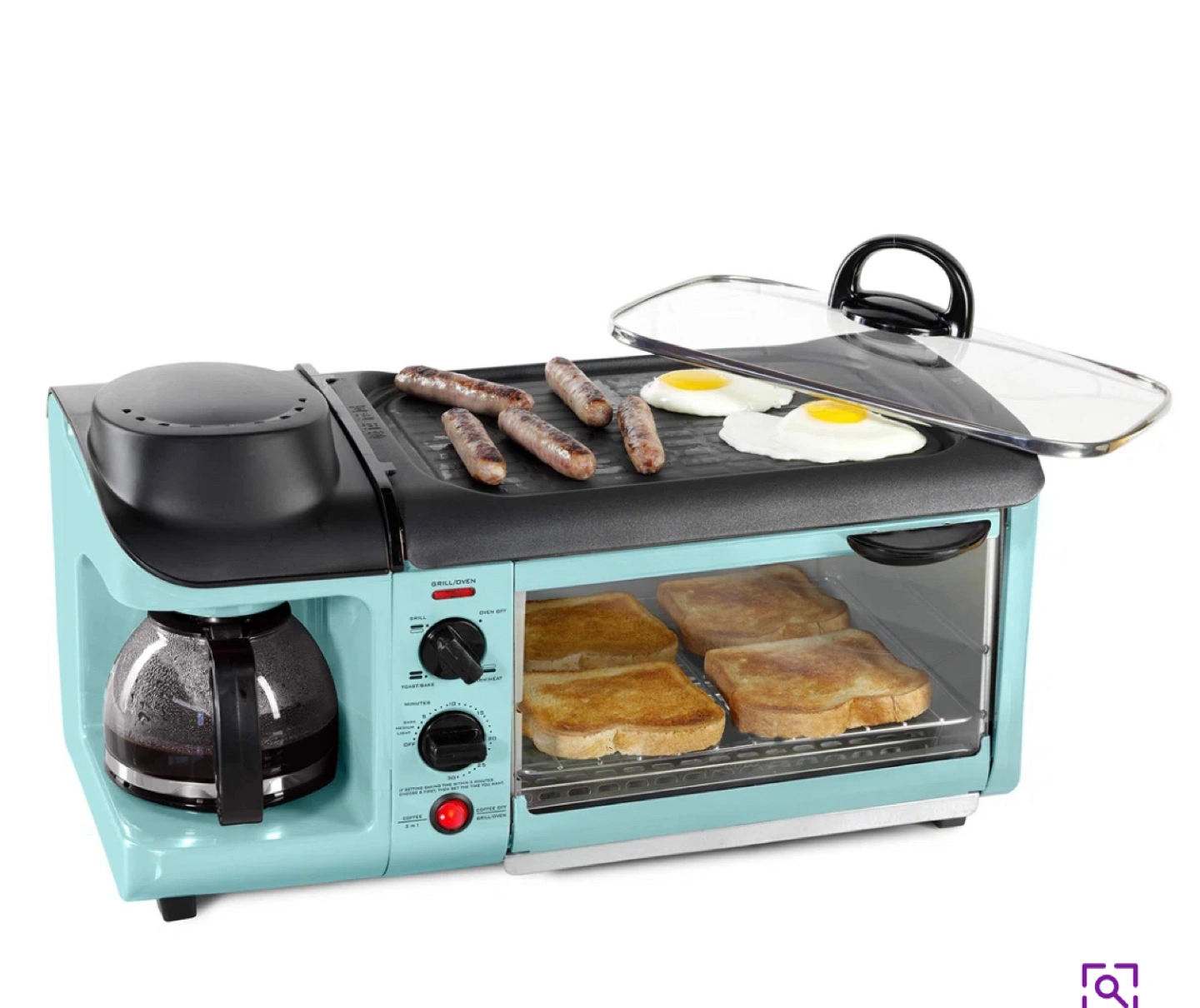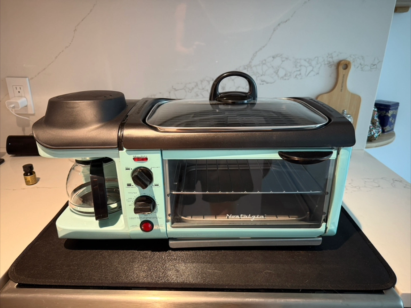Used only once! Get your breakfast done with this Nostalgia 3-in-1 breakfast station! It combines a coffee maker, toaster oven, and griddle, all in one appliance. The light blue color adds a fun, retro touch to your kitchen. Perfect for small spaces and quick meals!