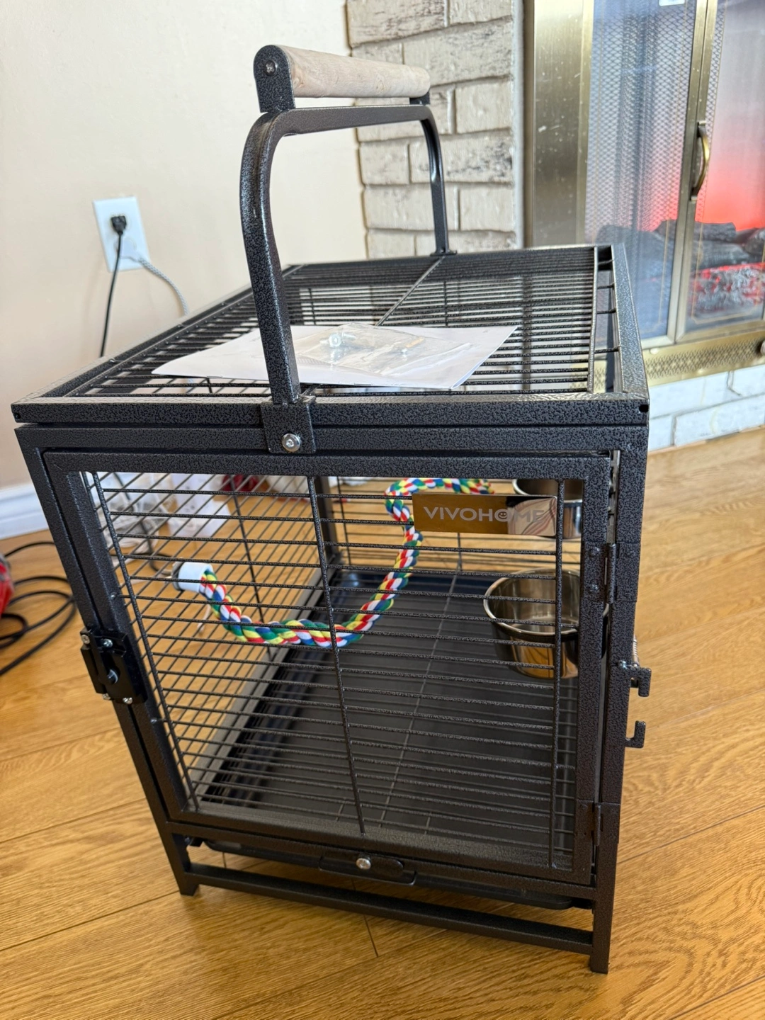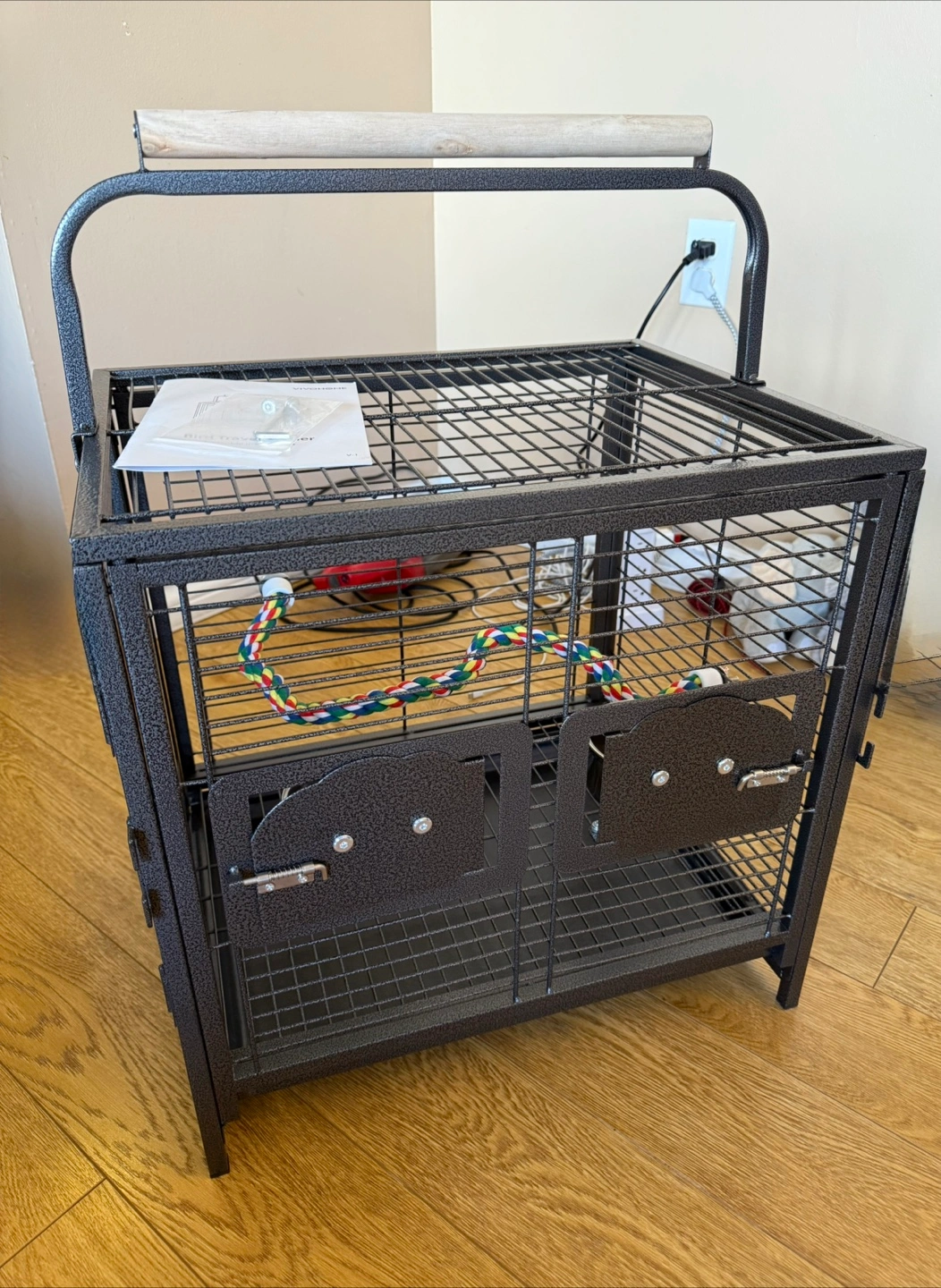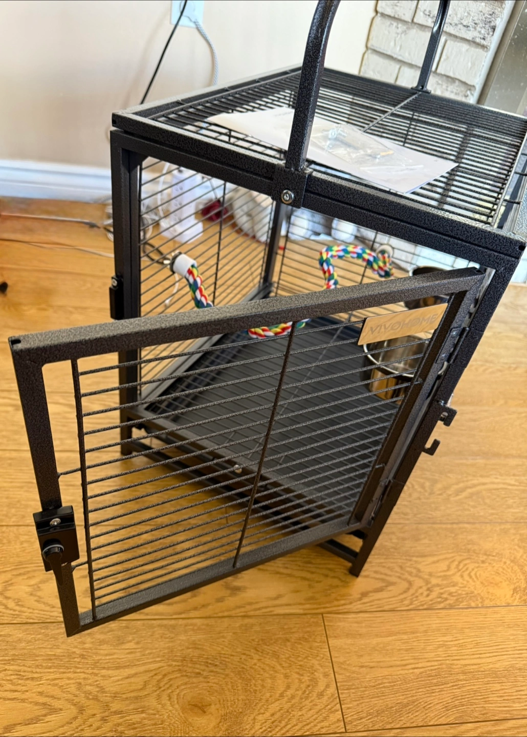 Selling a VivoHome bird carrier/ cage. Brand new. Already assembled but never used. stainless steel bowls and a colourful rope perch. Very easy to add more perches. Premium low carbon steel frame that is wear and rust resistant. 18.7”Lx14.9” Wx18” H. 0.79”(20 mm) space between wires makes it perfect for Parrots Conures Lovebird Cockatiel and Parakeets. Wooden perch at top which is also a handle to carry the cage. Removable waste tray and a big side door for convenience.