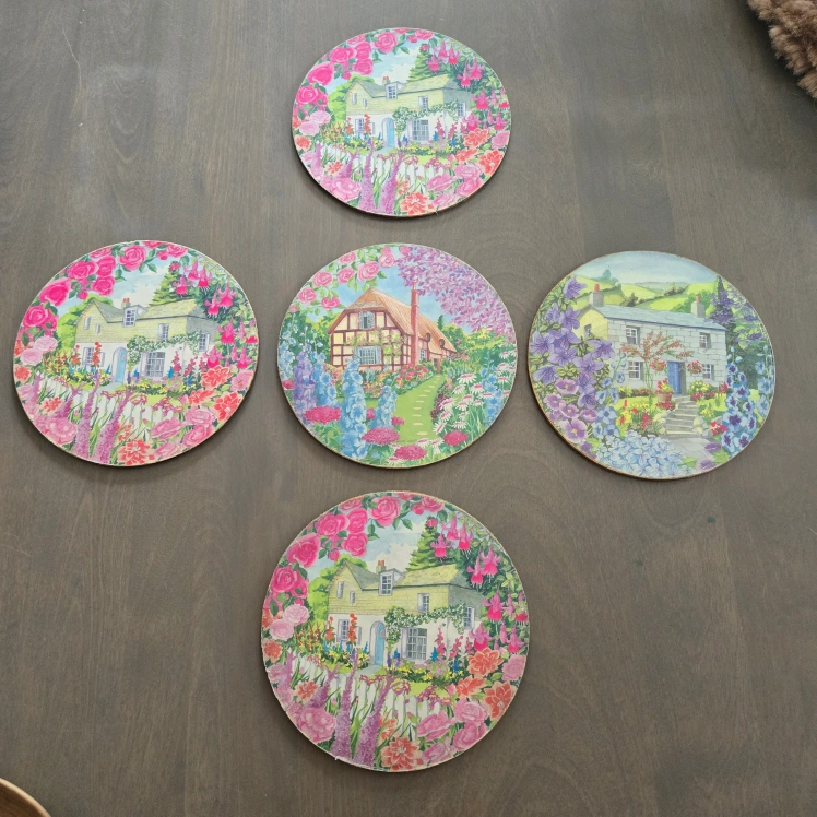 These adorable cork trivets would add a lovely touch to any home! Use them to hide the burners on your stove or as kitchen decor anywhere. Perfect for adding a touch of charm to your coffee table or bar cart. The pattern is absolutely beautiful they are approx 6.5 to 7 inch diameter and in great condition! They have a country homes with floral design.