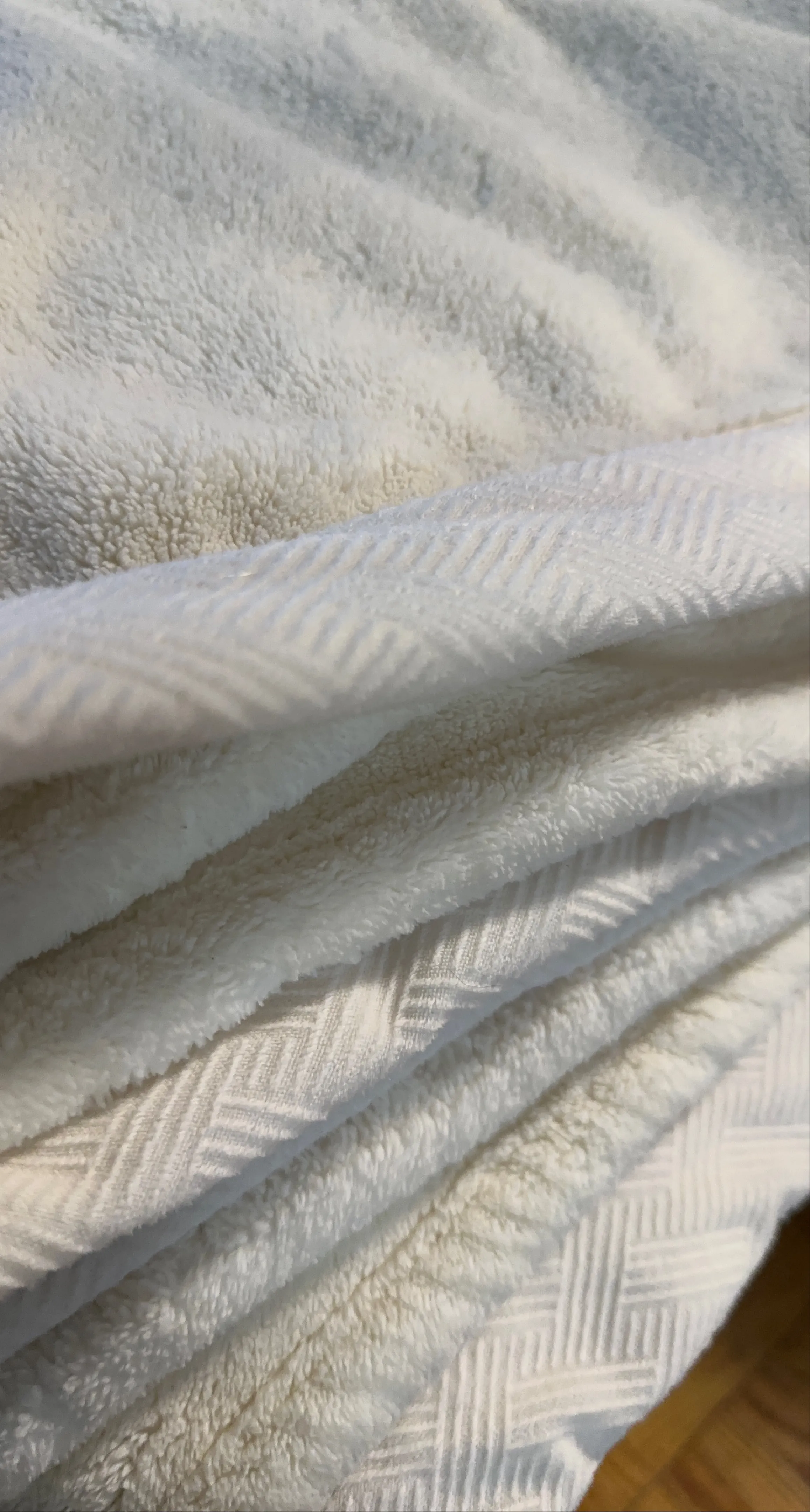 Selling a Kirkland Signature plush blanket in queen size. It's white and made of 100% polyester. The dimensions are 248 cm x 233 cm / 98 in x 92 in.