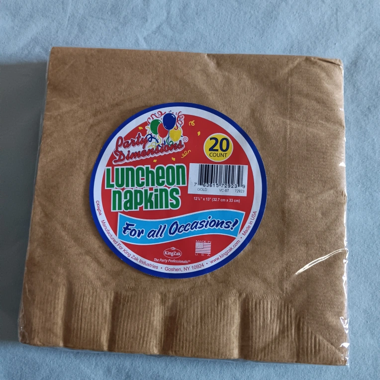 pack of Party Dimensions luncheon napkins! This is a 20-count pack of gold-colored napkins, perfect for any occasion. They measure 12 ½" x 13" (32.7 cm x 33 cm).