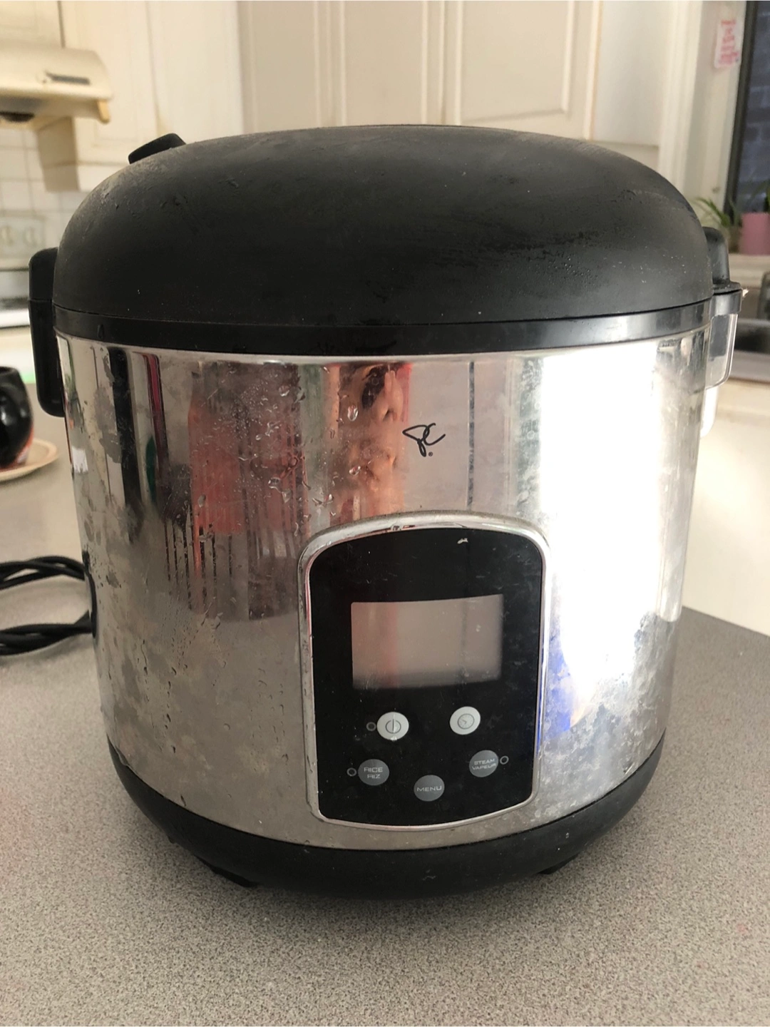 Selling a used rice cooker. It's in good working condition and comes with the power cord. It has a stainless steel exterior and a non-stick interior pot. Perfect for cooking rice for the whole family!