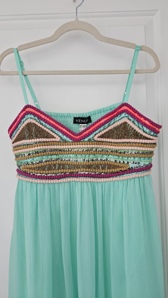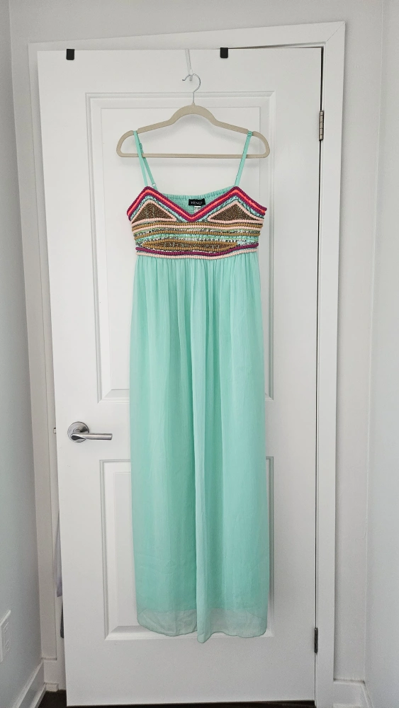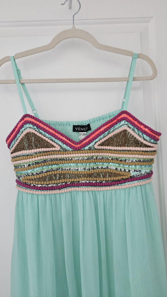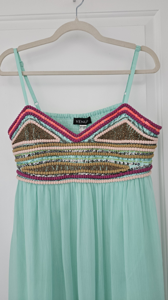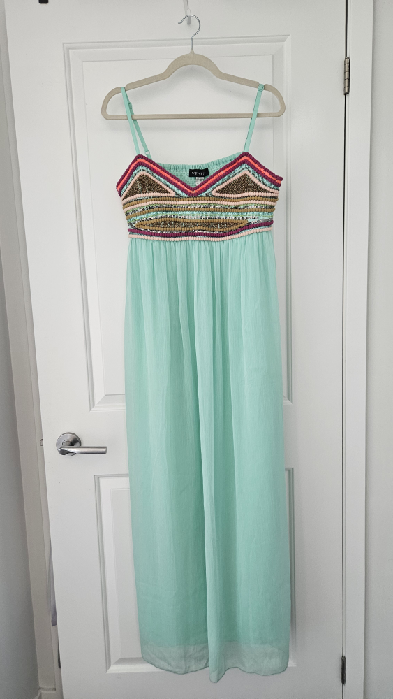 NEGOTIABLE. Selling a beautiful aqua maxi dress from Venus! It features a colourful beaded design on the bodice and is a size large. Perfect for summer! Really stunning dress!