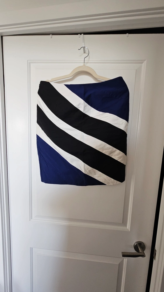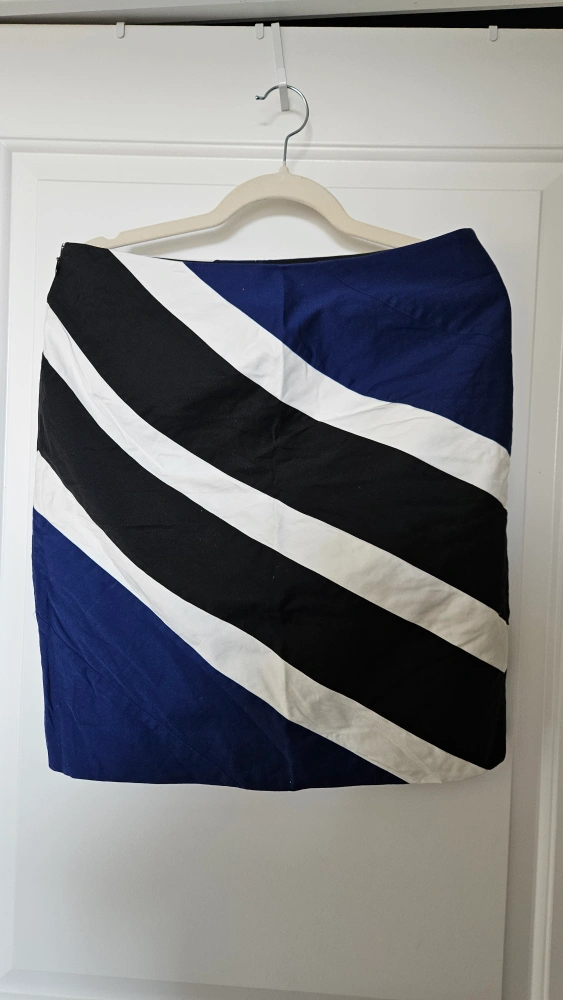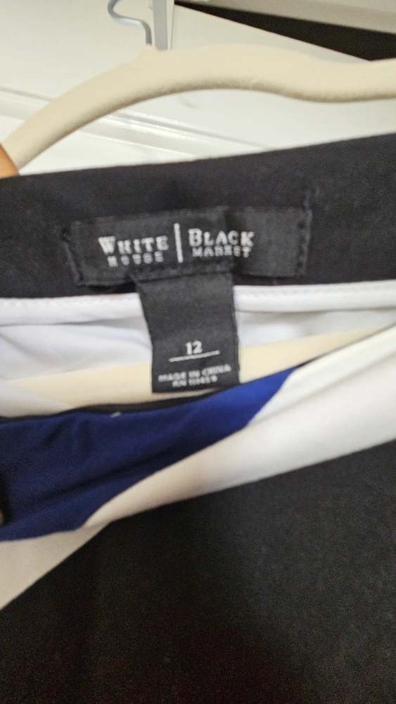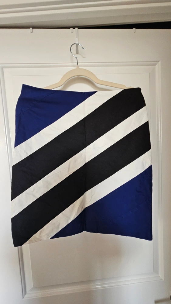 Here's a stylish skirt from White House Black Market! It features a bold striped pattern in blue, black, and white. The size is 12 but also fits a medium (Size 8-10)