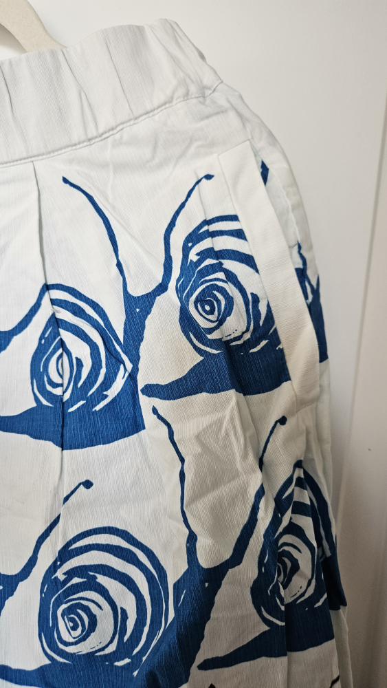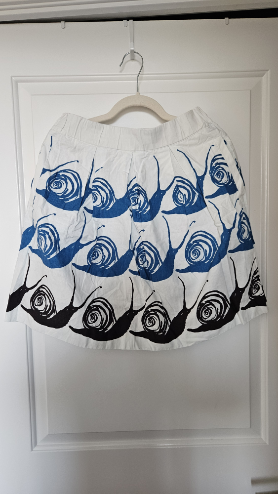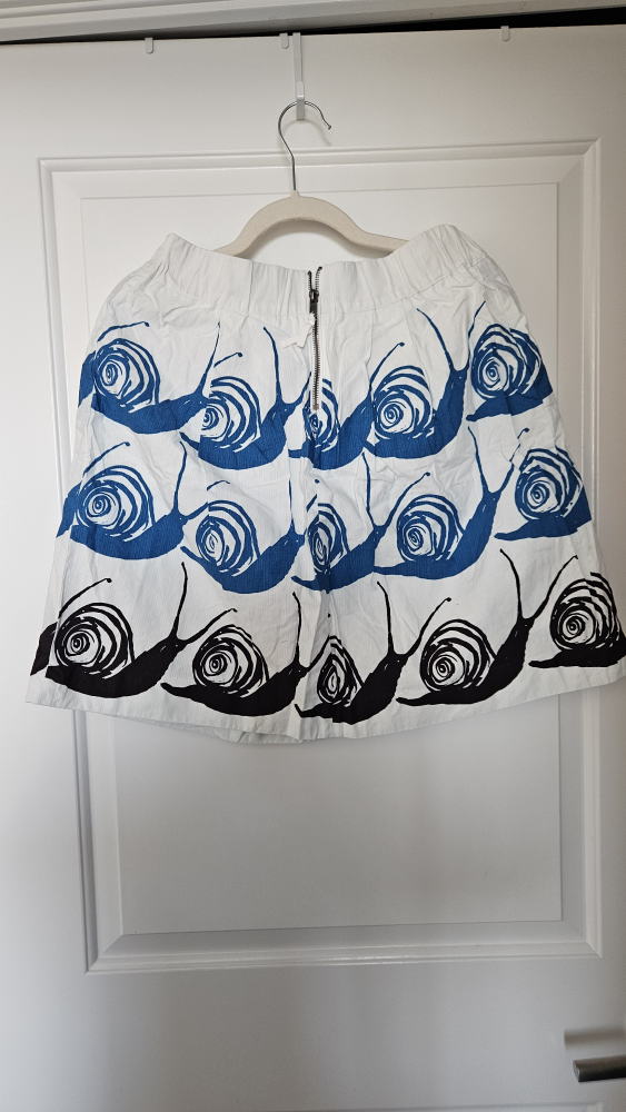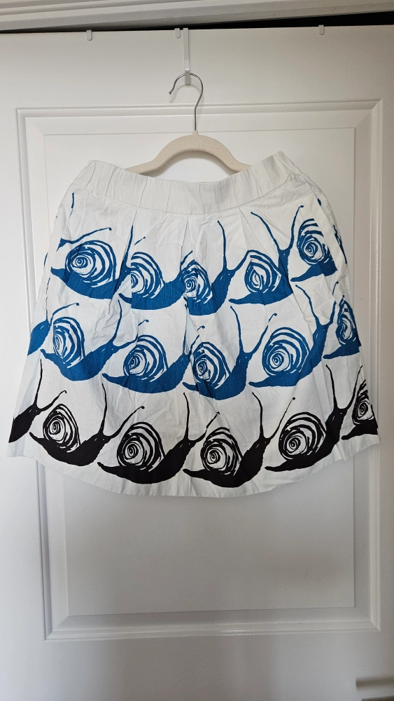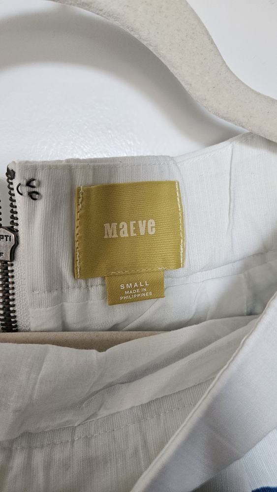 This is a Maeve skirt in size small. It features a fun design in blue and black on a white background. Perfect for adding a unique touch to your wardrobe this summer!