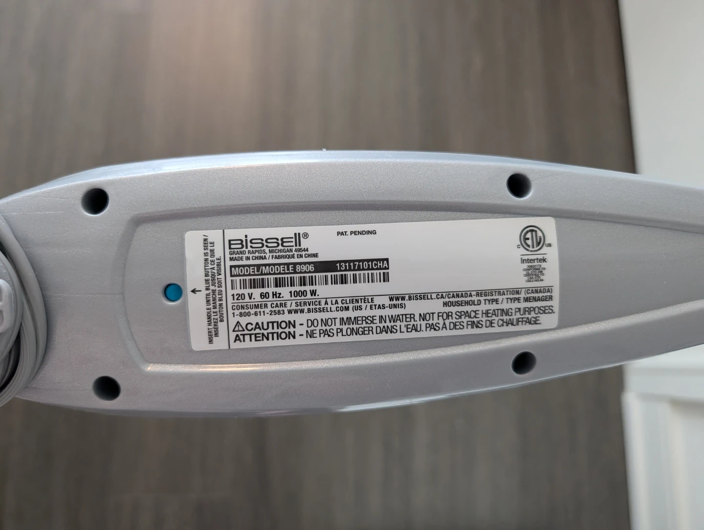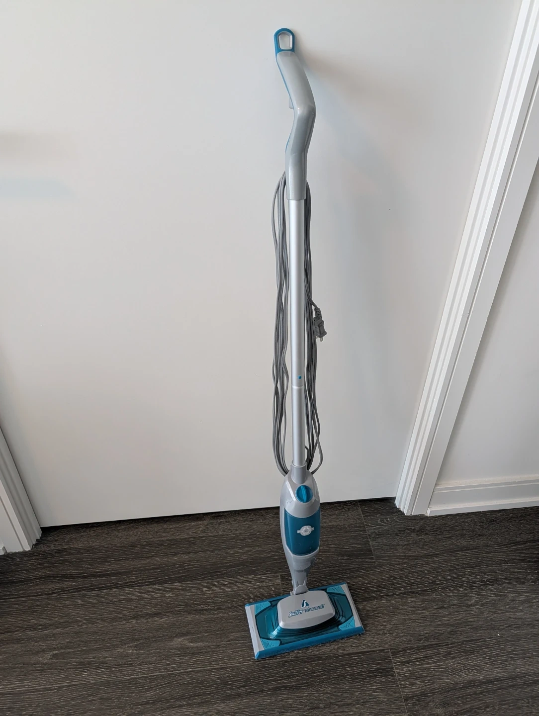 Gently used Bissell steam mop, model 8906. It's a 1000W household steam cleaner. This steam mop is great for quickly cleaning hard floors.